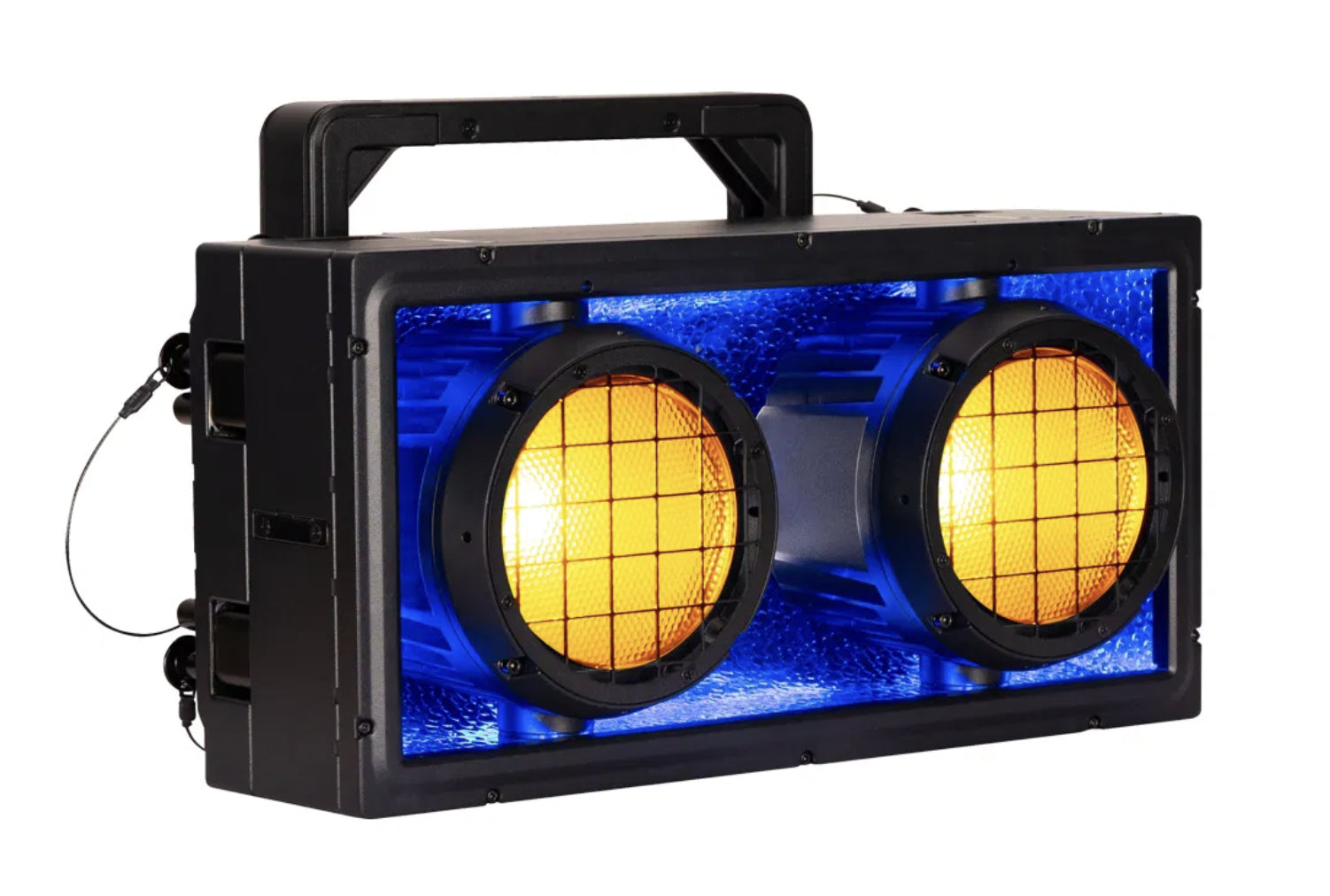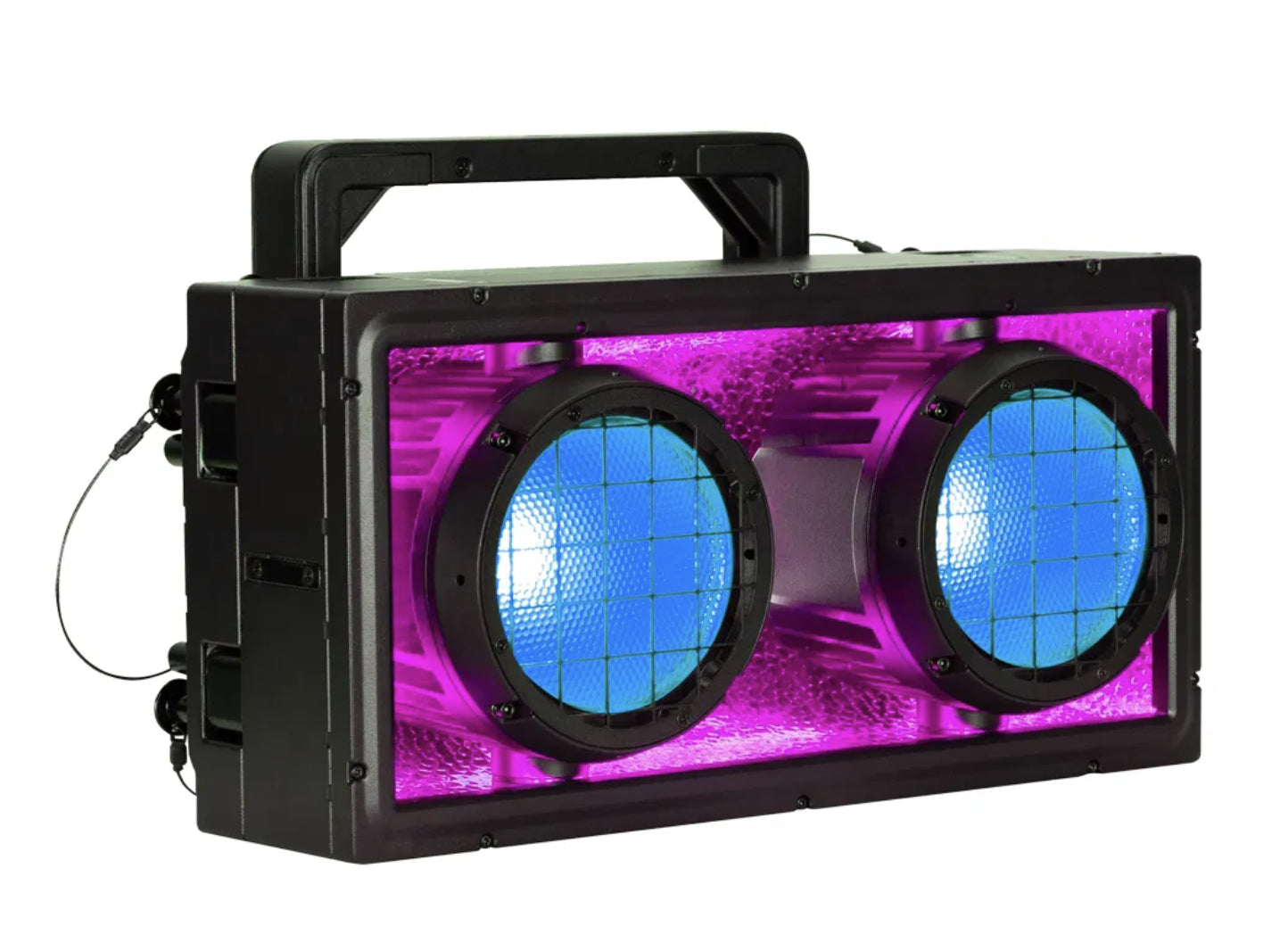 Two-cell five-colour (RGBAW) LED blinder with RGB background LEDs. Individually controllable cells. Built-in cell programs and built-in background LED programs. Tungsten control mode and variable white colour temperature control from 2,700K to 6,500K. User-selectable LED refresh rates from 900Hz to 25kHz. Six dim modes and four dim curves. Electronic strobe from 1–20Hz and electronic dimming. Includes Aria X2 wireless management system.