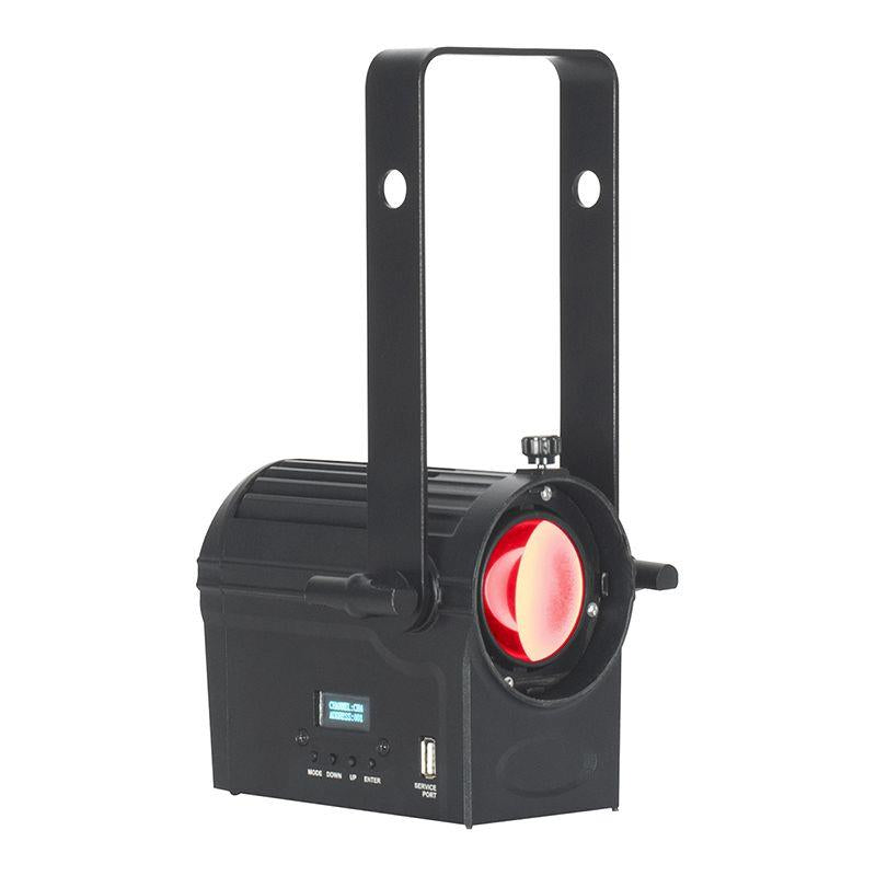 The Artisan 1000 RGBA Fresnel with a 100W quad-colour COB LED is ideal for schools, churches and stages and making it an ideal replacement for tungsten fixtures. The beam angle is manually adjustable, with all other features being controllable via the 4 button menu and OLED display or by DMX. The USB socket on the back panel allows for an optional W-DMX compatible transceiver, further expanding the fixtures versatility with wireless master/slave or DMX control.
