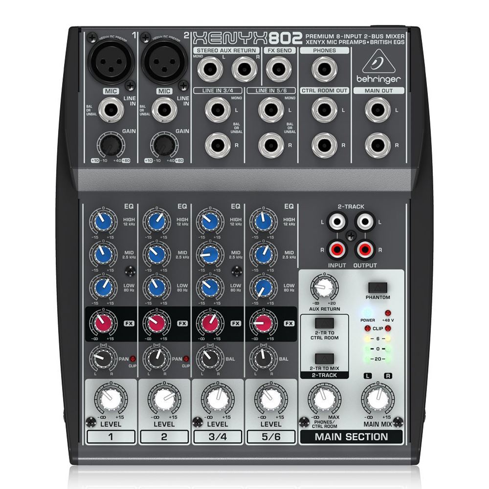 The XENYX 802 has 10 inputs and a FX Send control for each channel. Additionally, assignable CD/tape inputs have been incorporated for routing flexibility. The new XENYX Mic Preamp matches the sound quality, transparency, headroom and even the dynamic range of boutique-style, stand-alone mic preamps and our neo-classic "British EQ" brings back the warmth and musicality of those '60s and '70s mega-console desks that made music history.