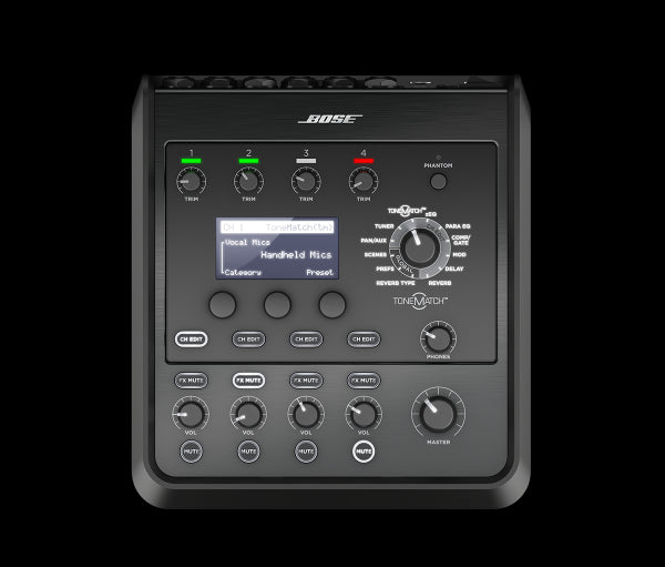 Take control of your music with the T4S ToneMatch mixer, an ultra-compact 4-channel interface designed for performers. Engineered with a powerful DSP engine and intuitive user control, the T4S offers studio-quality EQ, dynamics and effects. Sound great with integrated Bose ToneMatch processing and zEQ, especially when connected to a Bose L1 or F1 system for full end-to-end tonal control. Play confidently on stage with the rugged T4S using its tactile controls, easy-to-read LED display and scene recall. The T4S, a true performer’s companion.