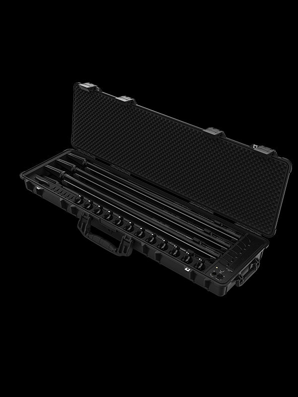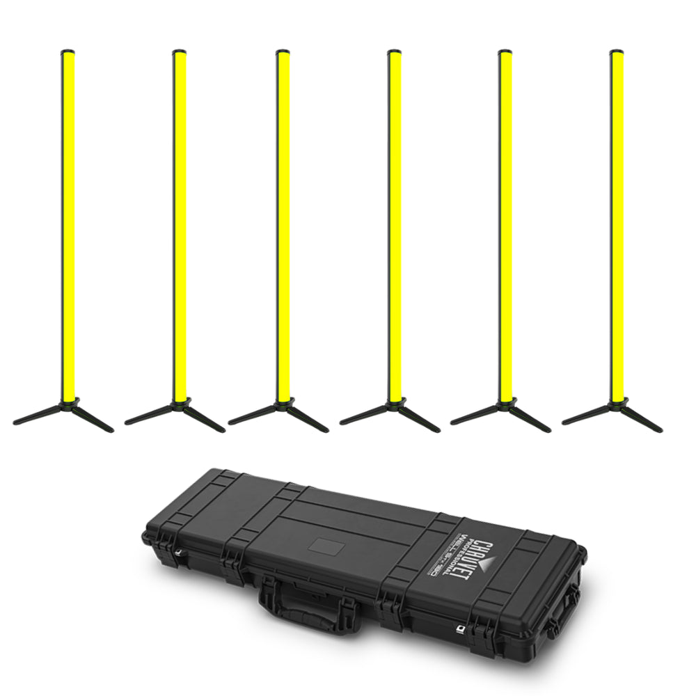 (6) pixel-mapping, battery-operated, 1 meter, IP65-rated LED strips with 180 degree viewing angle, including (6) mounting stands, (12) magnetic brackets, (6) hanging eye bolts, (6) stealth black filters (1) IR remote, and (1) charging case