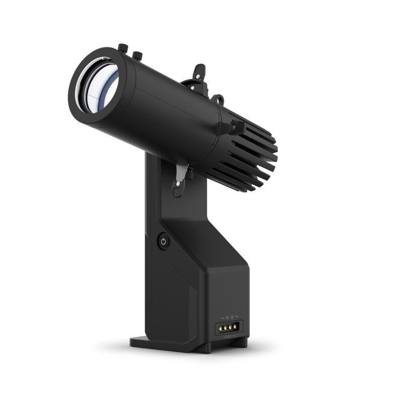 A completely wireless, IP 65 rated, battery powered Gobo Projector with a cool white LED and manual framing shutters that is controlled by W-DMX, IR remote (not included), or manually from the OLED display