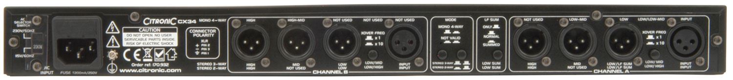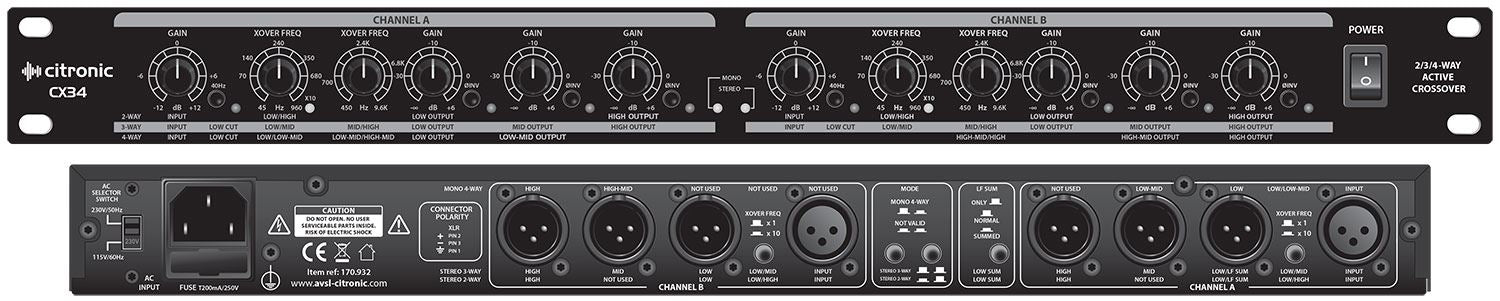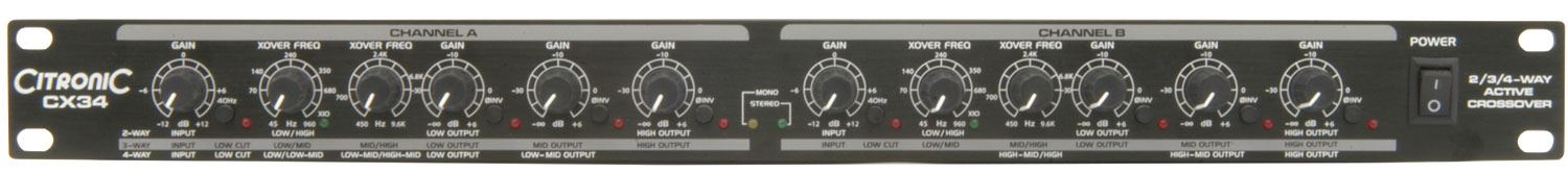 The CX34 is a 2 or 3-way stereo or 4-way mono active crossover designed to split frequencies so that low frequencies are delivered to the amp driving the sub cabinets and mid/top frequencies are delivered to the amp driving the mid/top frequency cabs. This type of system is more efficient and delivers more accurate sound quality, especially in larger PA systems.