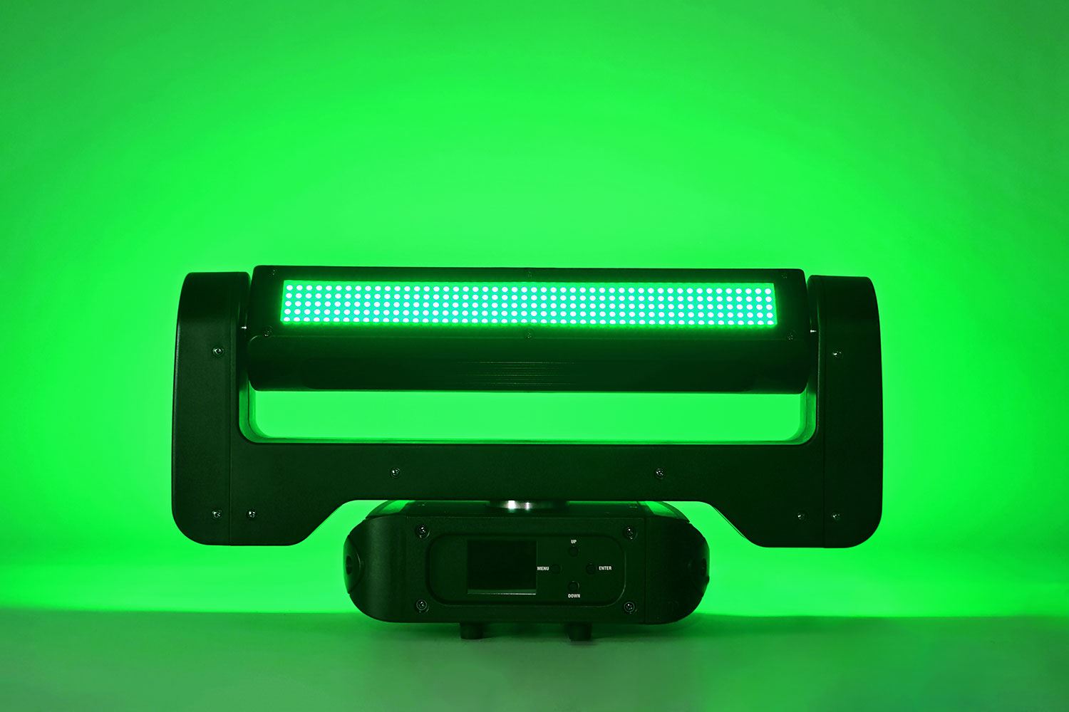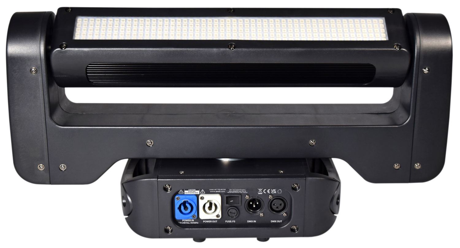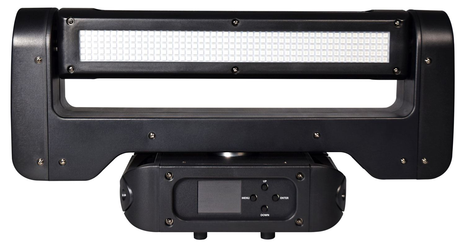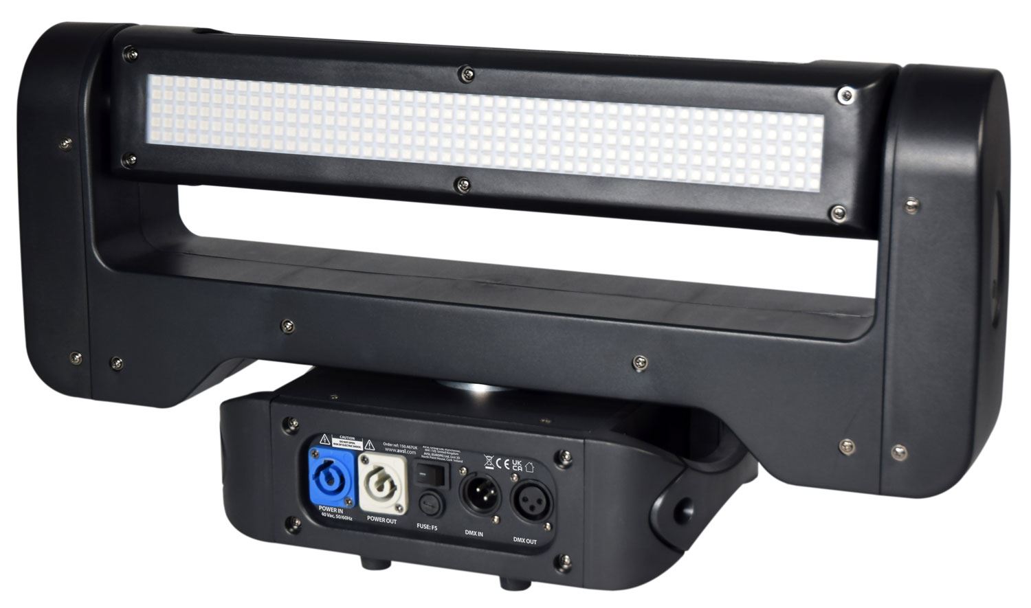 A mesmerizing moving head comprising 2 panels of 250 bright RGB LEDs which combine with infinite Pan and tilt movement to provide room filling effects from any position.