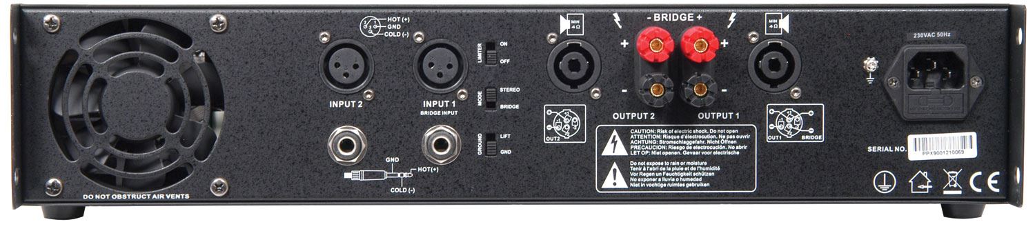 19" rackmount 2U power amplifiers with fan cooling and output protection. Balanced inputs via 6.3mm jack or XLR sockets, speaker outputs on 2 SPK connectors or 4mm binding posts. Switchable ground lift, bridge mode and clip limiter.