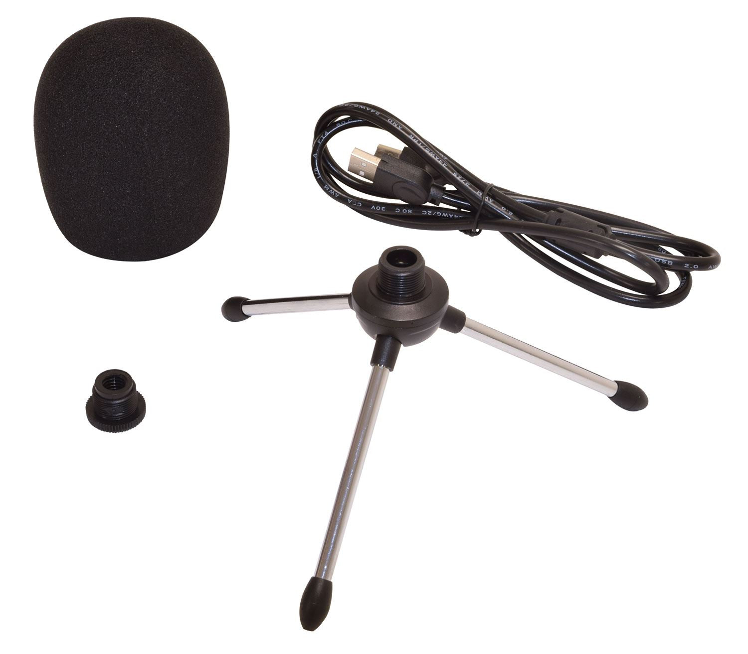 Studio style condenser microphone for podcasting and vocal recording. Fitted with a precision 15mm back-electret capsule for audible detail, driven by an onboard preamp with a built-in echo effect and headphone amplifier. Connection to a PC or Mac computer is via the supplied USB lead and serves as a plug & play USB audio device. The complete assembly is housed in a black anodised die-cast body with a protective steel grille for the capsule. Supplied with a mic stand clamp and mini tripod for convenient, table-top operation.