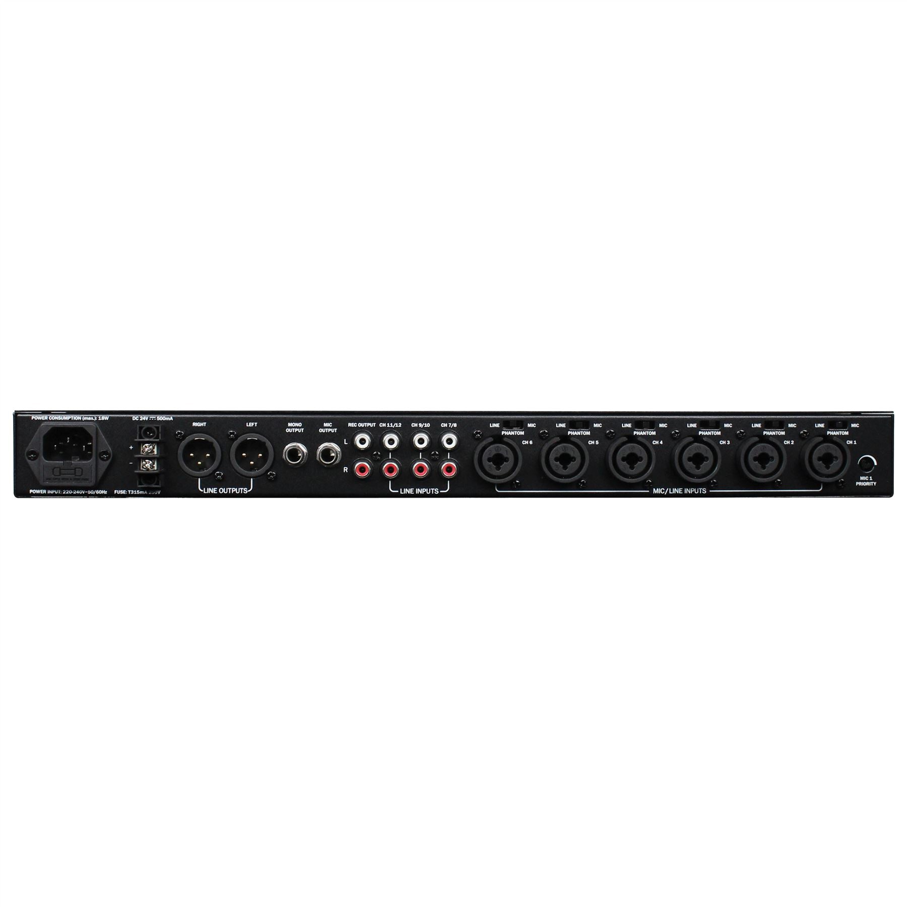 Six mono channels with combo XLR/Jack input, each with Mic/Mic+ Phantom/Line selector