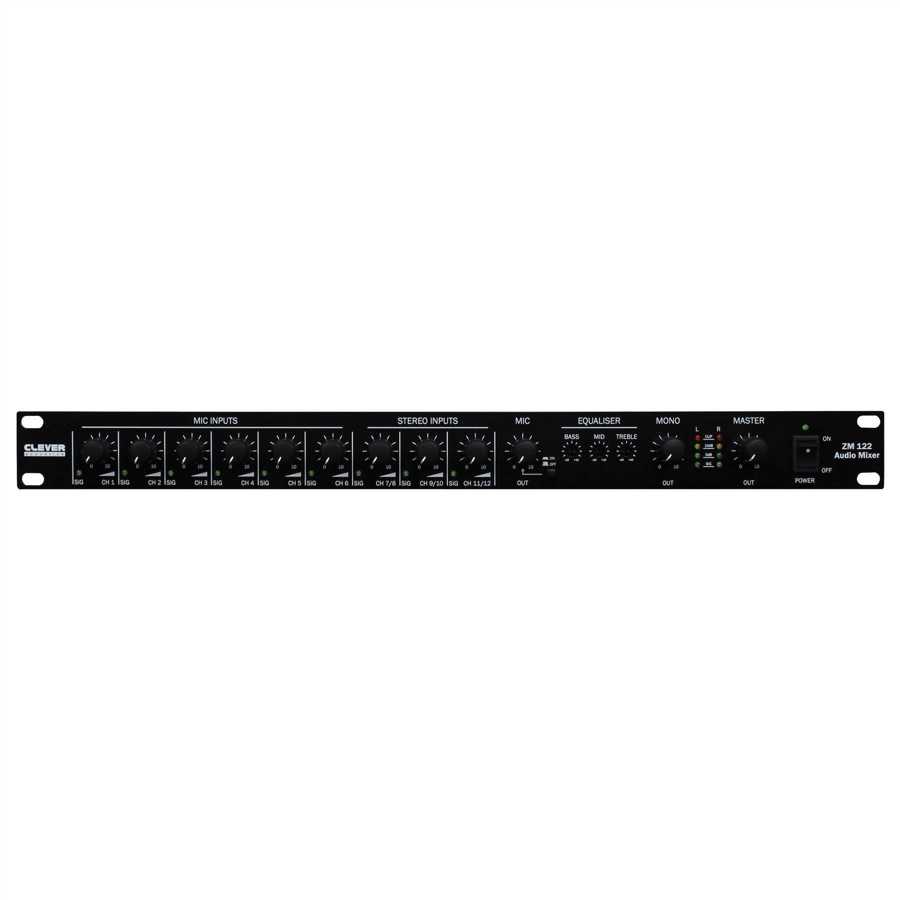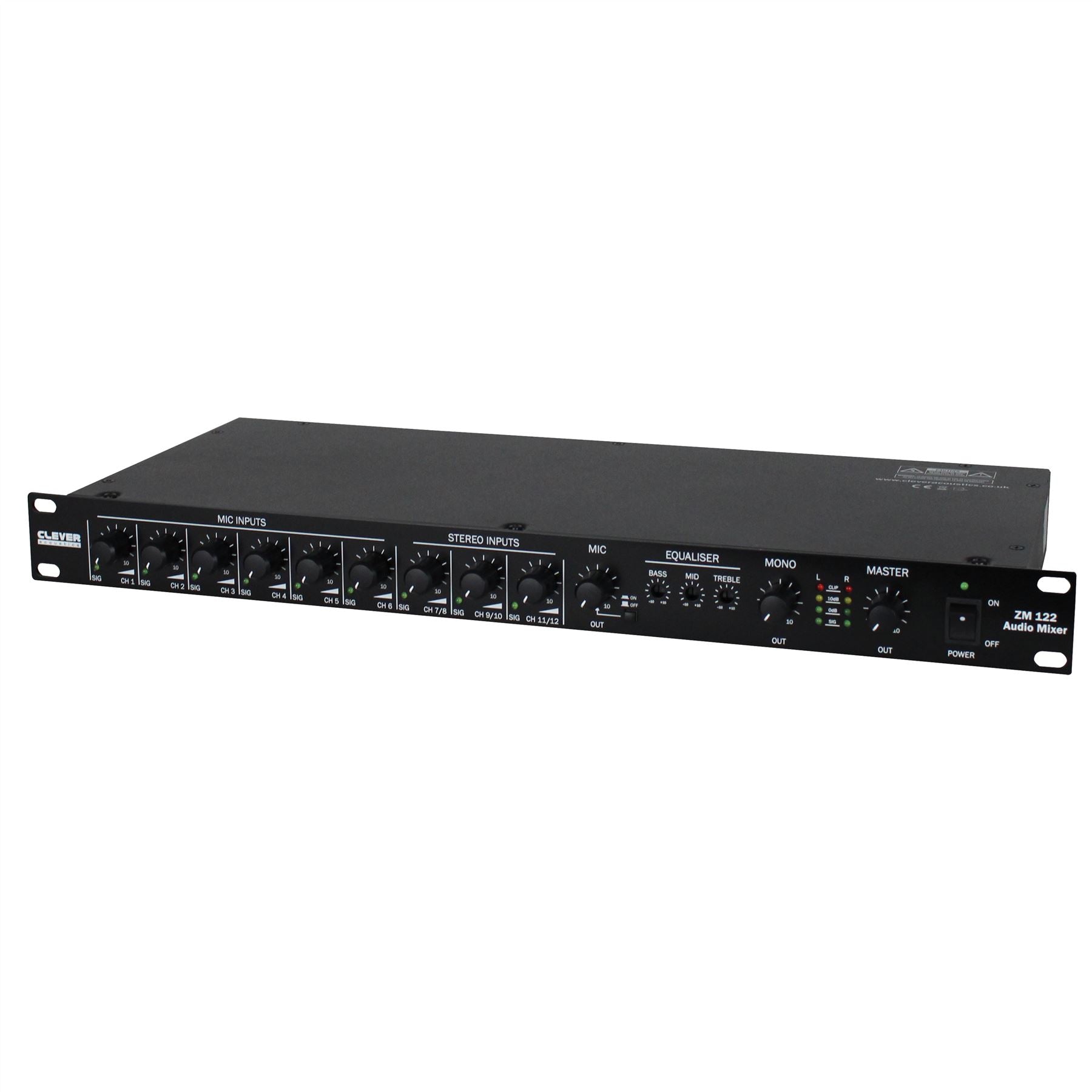 Suitable for use in a wide range of applications, the ZM 122 offers the user a clean, simple control surface while retaining a large number of features for complex audio systems. The ZM 122 mixer has 9 input channels, each with adjustable volume controls.Six of the channels are microphone inputs with XLR 1/4” combo sockets, the other three are RCA line-level stereo inputs. Adding to the features, the ZM 122 has a 3 band EQ, mono out and microphone out all in a 1U 19” rack mount unit.