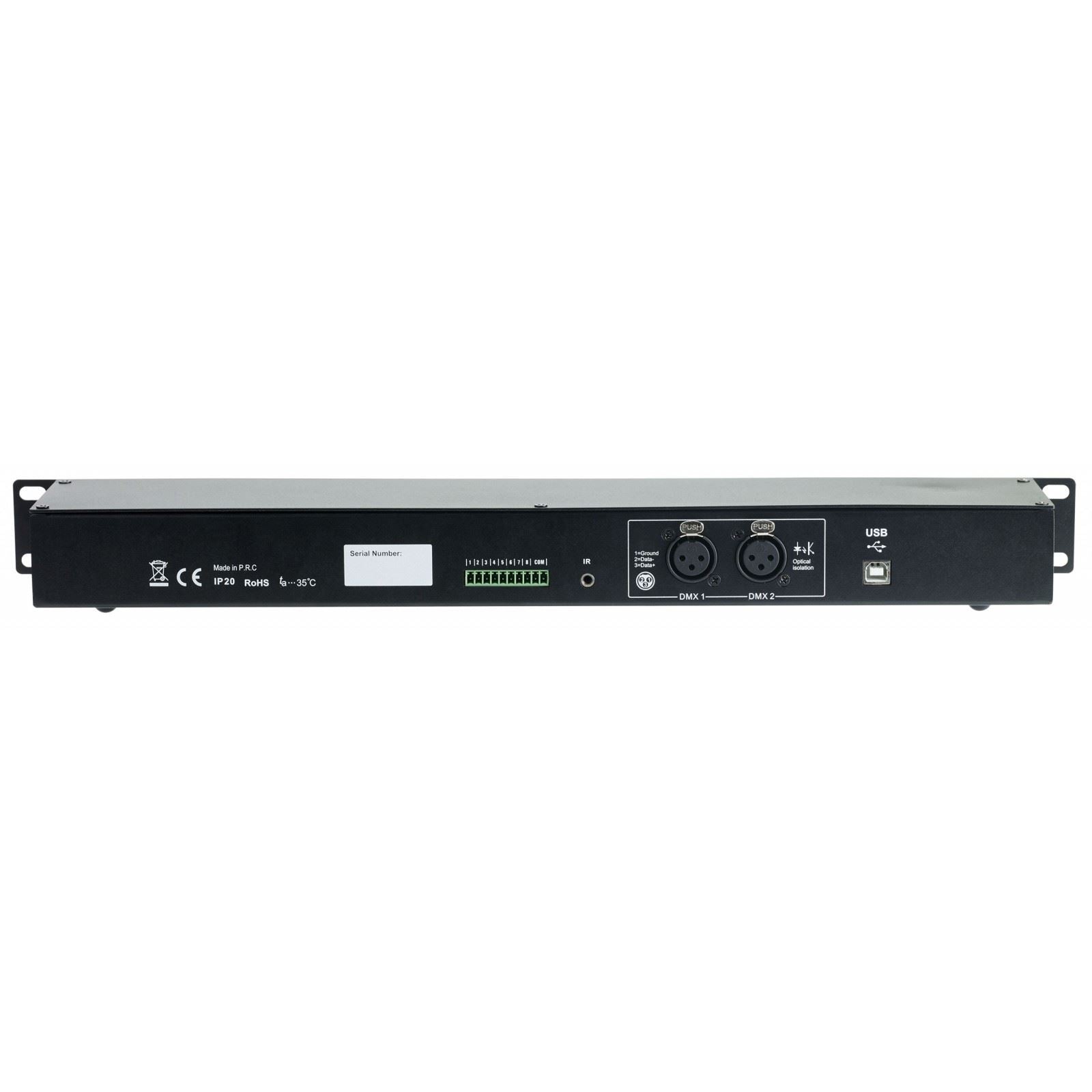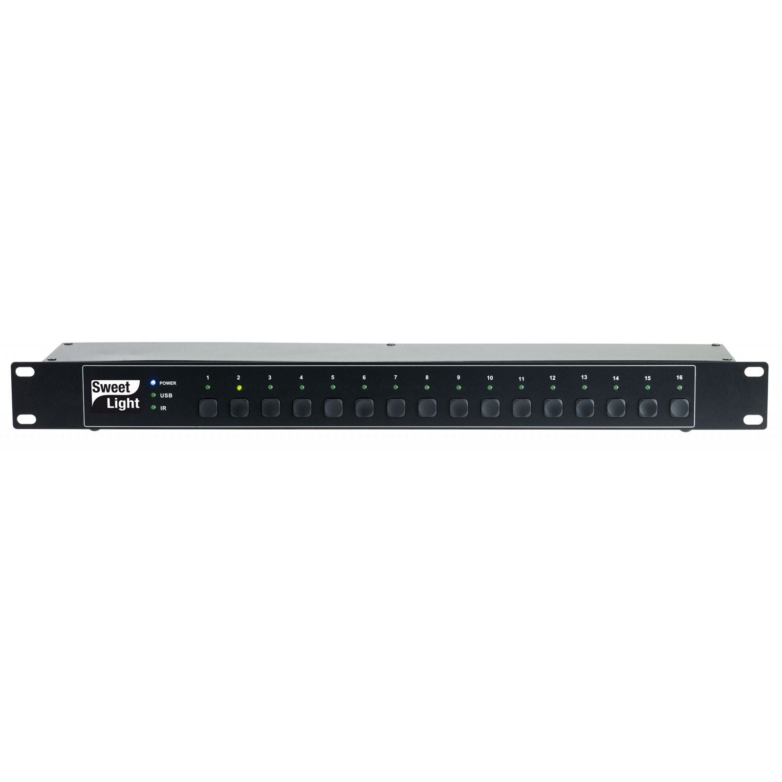 The extensive 19-inch Contest Sweet Rack 1024 standalone DMX interface has a whopping 1024 DMX channels or 1536 digitial Artnet channels divided over four zones and comes with its own remote control. This unit can, of course, be hooked up to and powered by a Windows or Mac using the included USB-B cable, but this is a standalone interface. So, in standalone mode, it offers 16 programmable dynamic scenes that can be triggered in a number of ways including the 16 flash buttons that line the front, the remote control, 8 external contacts or by setting the date and time.