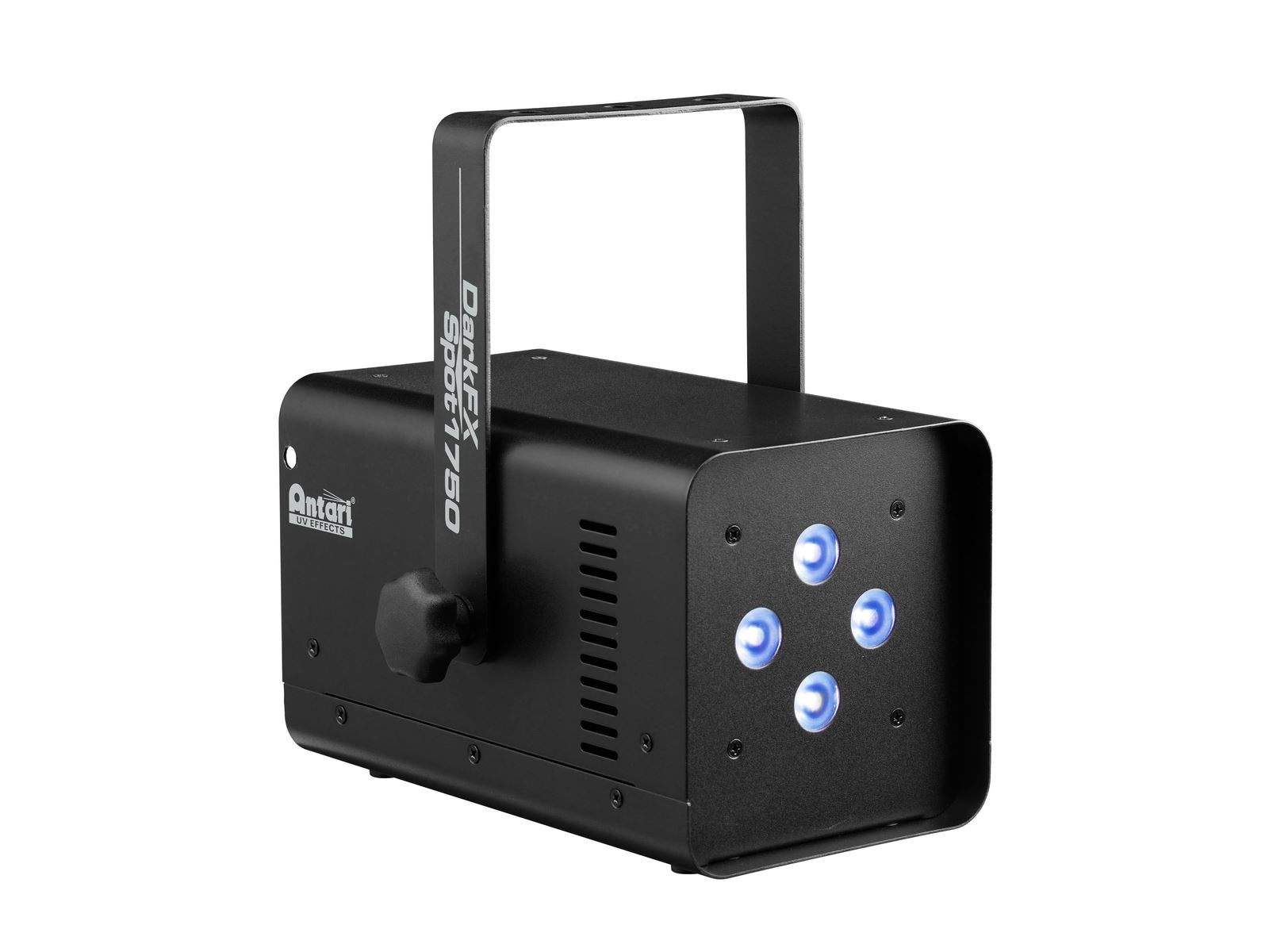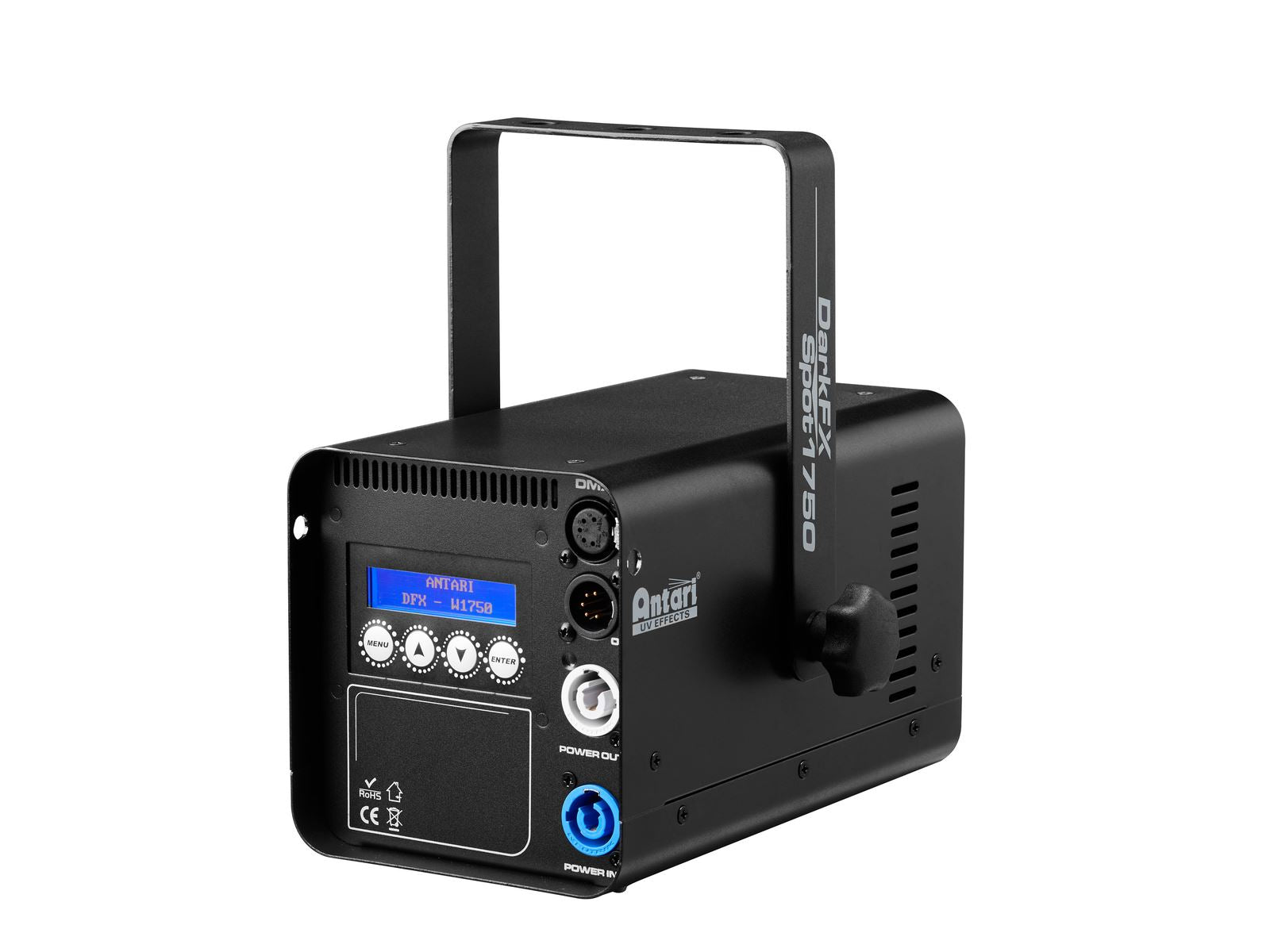 The Antari DarkFX Spot 1750 is an efficient high-output and low-power consumption UV LED spot that delivers a peak wavelength of 365 nm and radiant flux output of 19,080 mW at full intensity with minimum visible light. This ensures all UV-reactive materials reflect perfectly with stunningly bright and vivid colors. Equipped with 4 x 16 W high-power UV LEDs, it features a 20° narrow beam angle, flicker-free operation, and special optics to prevent wear degradation from high UV exposure. This IP20-rated LED spot comes with an aluminium housing with an adjustable bracket for versatile mounting options. The DarkFX Spot 1750 is operated in one of two modes: Either in DMX mode with 2 channels via the 5-pin XLR connectors or in stand-alone mode via the LCD display and the 4 operating buttons. Use the powerCON input to connect it to the mains.