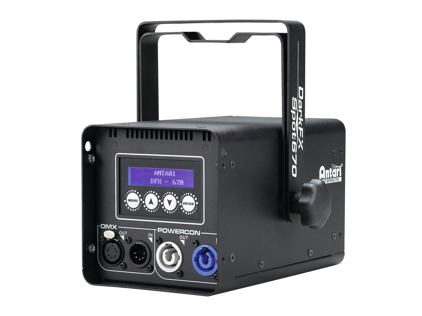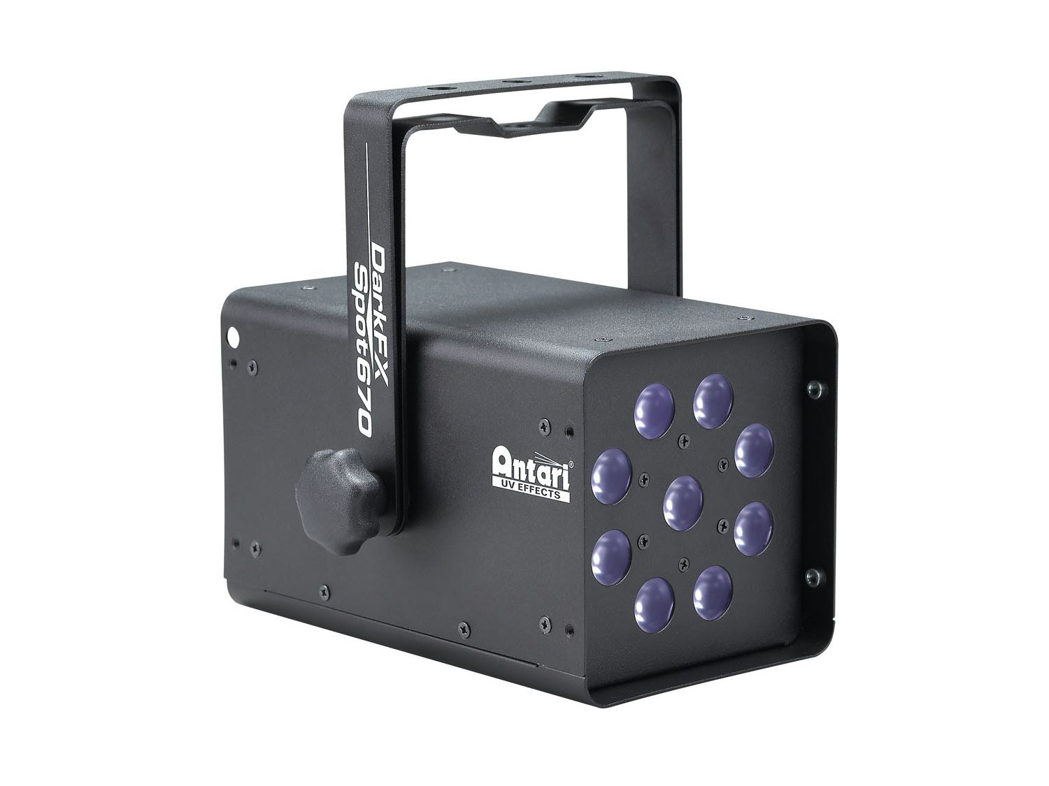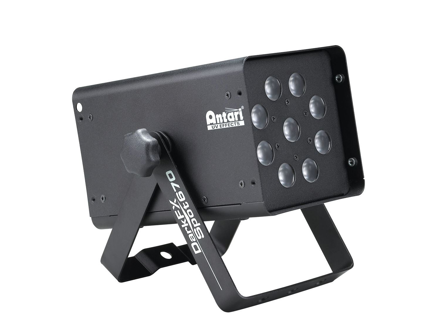 The Antari DarkFX Spot 670 is an efficient high-output and low-power consumption UV LED spot that delivers a peak wavelength of 365nm and radiant flux output of 6760 mW at full intensity with minimum visible light. This ensures all UV-reactive materials reflect perfectly with stunningly bright and vivid colors. Equipped with 9 x 1.9 W high-power UV LEDs, it features a 15° narrow beam angle, flicker-free operation, and special optics to prevent wear degradation from high UV exposure. This IP20-rated LED spot comes with an aluminium housing with an adjustable brackets for versatile mounting options. The DarkFX Spot 670 is operated in one of two modes: Either in DMX mode with 2 channels via the 5-pin XLR connectors or in stand-alone mode via the LCD display and the 4 operating buttons. Use the powerCON input to connect it to the mains.