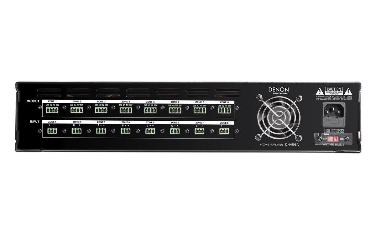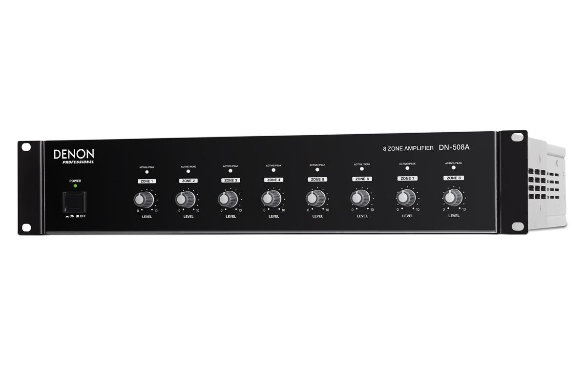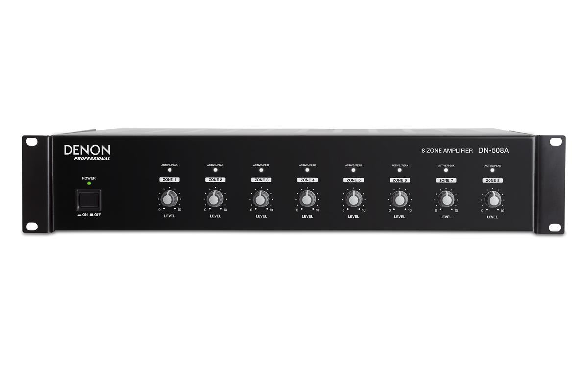 The Denon Professional DN-508A is an 8-channel zone amplifier perfect for commercial applications such as background music, paging, multi-zone entertainment, etc. It features eight channels of efficient, cool-running Class D amplification, each rated at 55 watts with less than 0.5% THD. Eurobloc connections ensure fast, reliable hook up—critical to your commercial/contractor business. There are individual volume adjustments and signal/peak indicators for every channel, giving you complete control of the system.