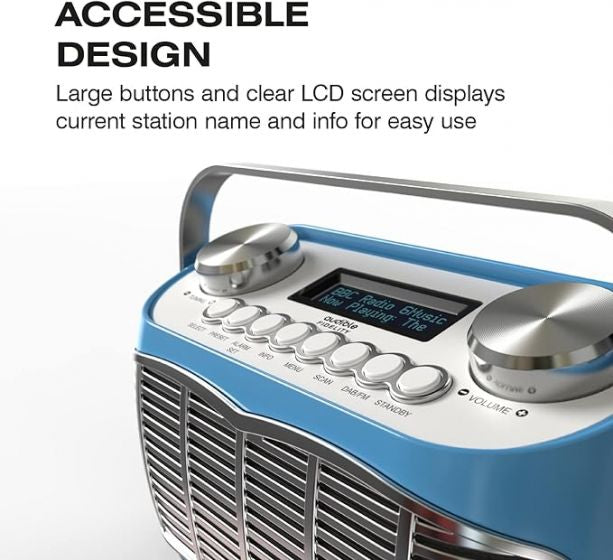 CLASSIC STYLING: The Detroit DAB Radio from Audible Fidelity combines timeless motor-city vintage design with the very latest in DAB/DAB+/FM digital radio technology performance, for a great addition to kitchen sides or bedroom tables. The accessible design houses large buttons and a clear, easy to read LCD display with station info.