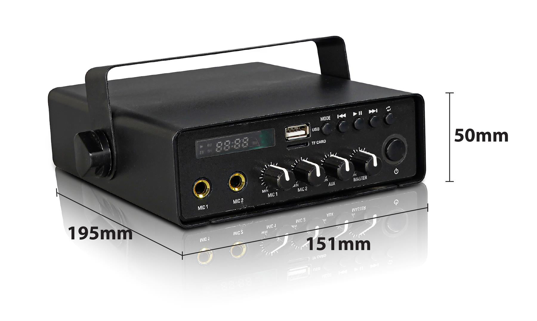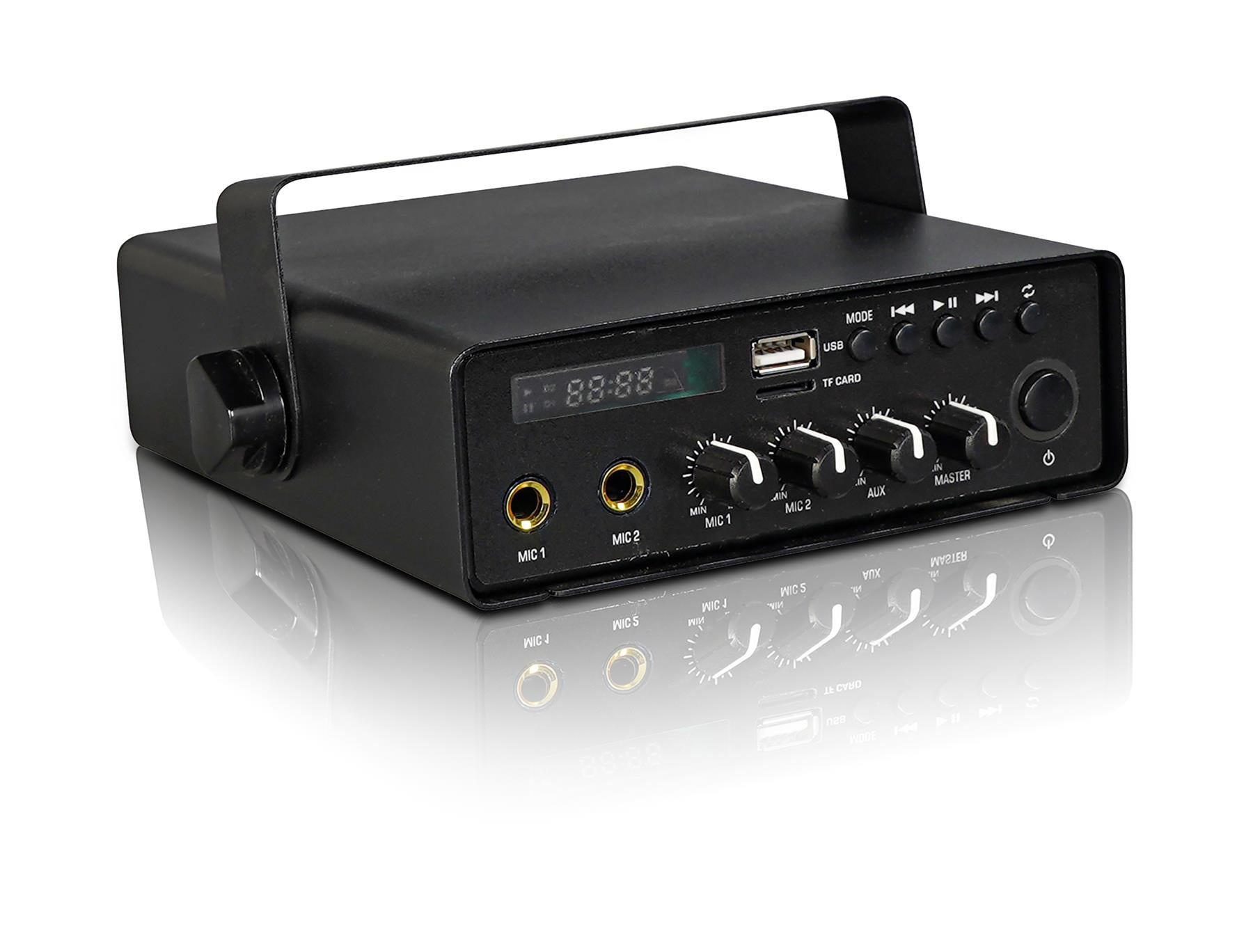 Easy to use desk top mixer amplifier with media player. The product features 2 dedicated microphone inputs (one with mic priority) and 1 line level (phono) and 1 x line level output all with independent volume control. Further to this the product contain a built-in media player with remote control. Supplied with 12V or 230V power supply input and undershelf mounting bracket.