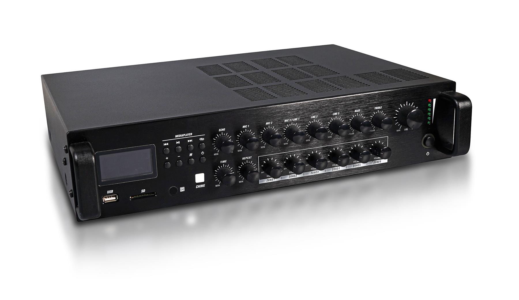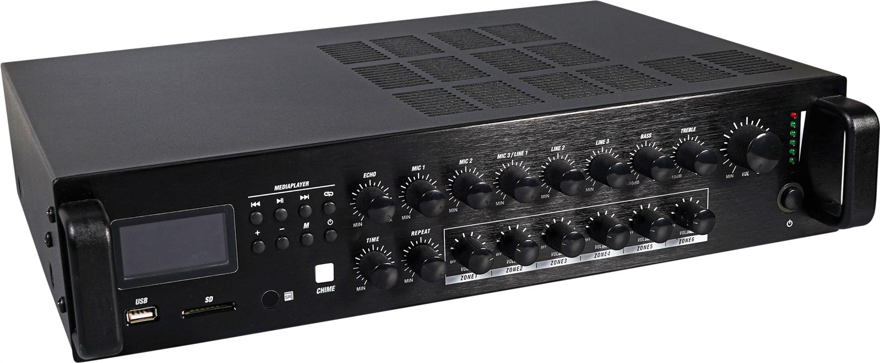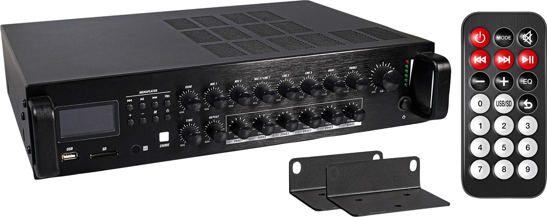 6 Zone mixer amplifier designed for multiple room commercial audio solutions. The product supports up to 3 microphones ( one with priority and two with 12V phantom power) and 3 line level inputs each with independent volume control and 6 zones output again with independent volume controls allowing the correct levels to be reached in each zone. Further to this product has a media player with FM radio, SD card reader and USB input controlled via the front panel or the remote control supplied, chime announcement facility all contained in a 2U high rack mounting case. Inputs are via combo jack/ jack and RCA phones and outputs are via terminal block. Supplied with rack mount ears.