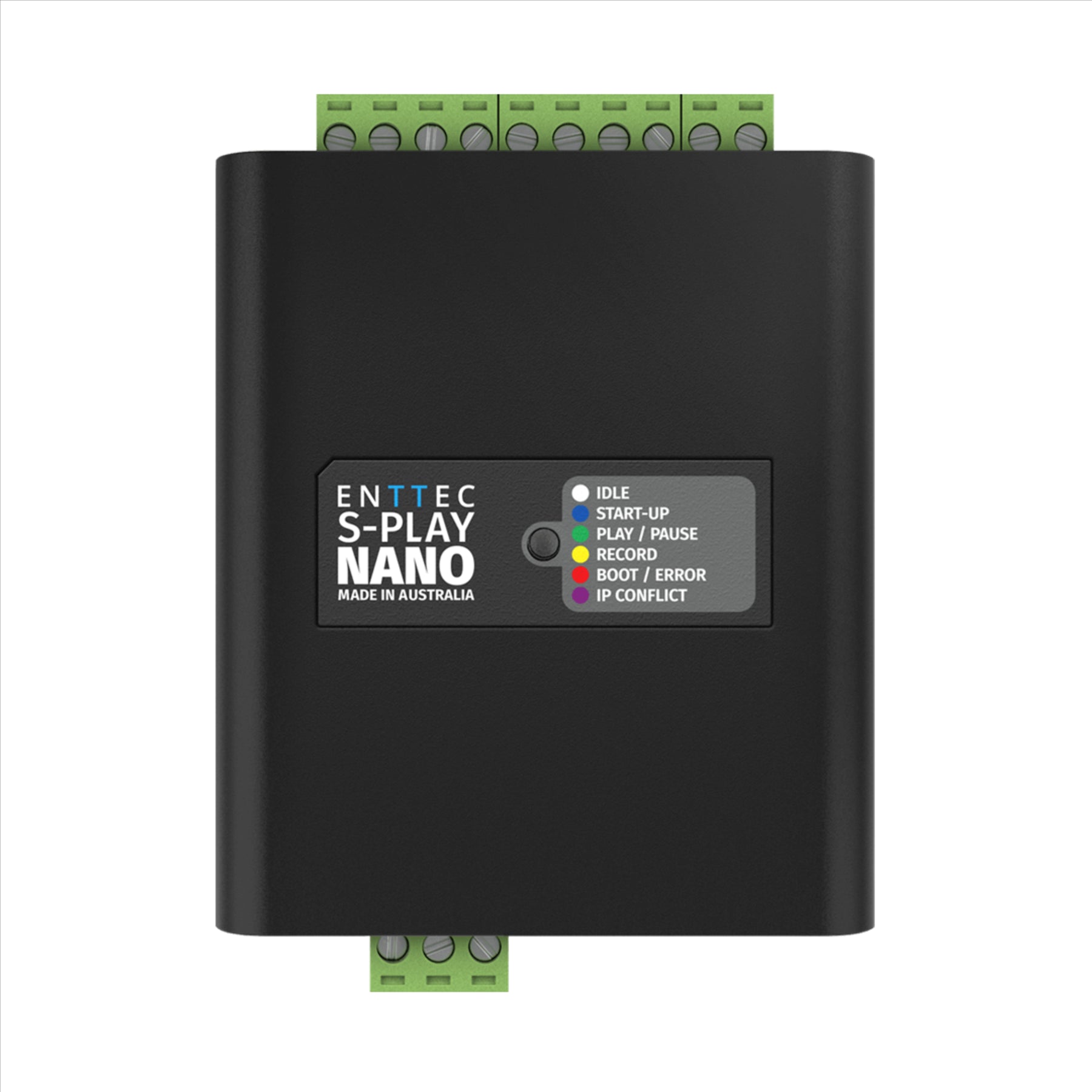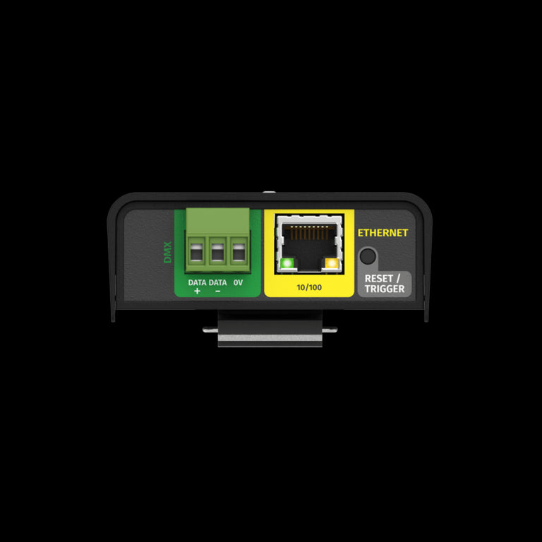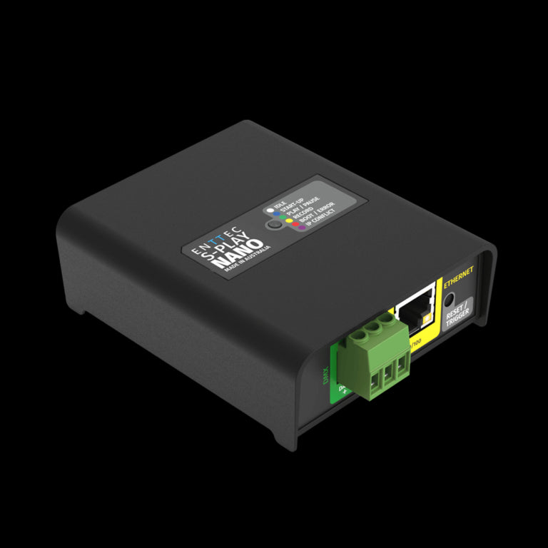 The ENTTEC S-PLAY NANO is a compact and powerful 1-universe DMX show controller designed for standalone lighting playback and automation. Featuring an intuitive web-based interface, this DIN-rail and surface-mountable unit allows recording, editing, and scheduling of lighting cues and playlists without the need for an external control system. Equipped with four digital inputs and one relay output, the S-PLAY NANO supports contact closure, UDP, and OSC triggers, making it ideal for integration into architectural, retail, and entertainment environments. With onboard memory, integrated web UI, and versatile trigger capabilities, it’s a streamlined solution for permanent installations requiring consistent and automated light shows.