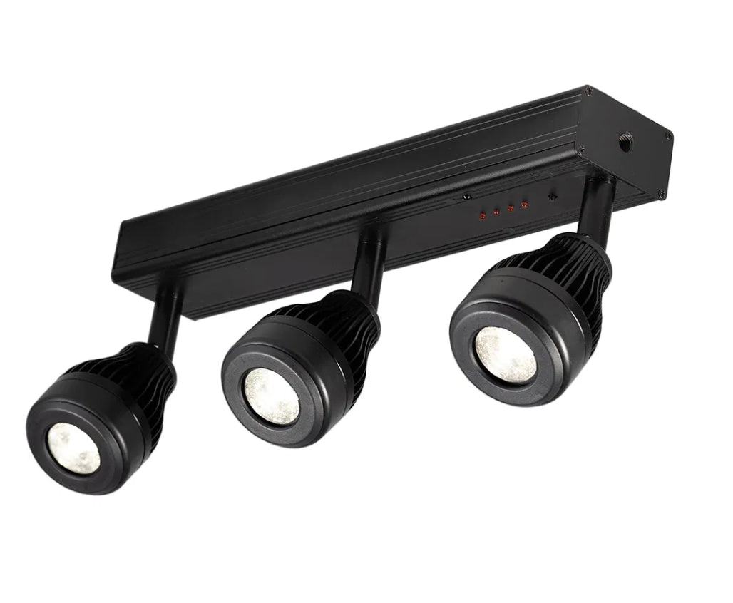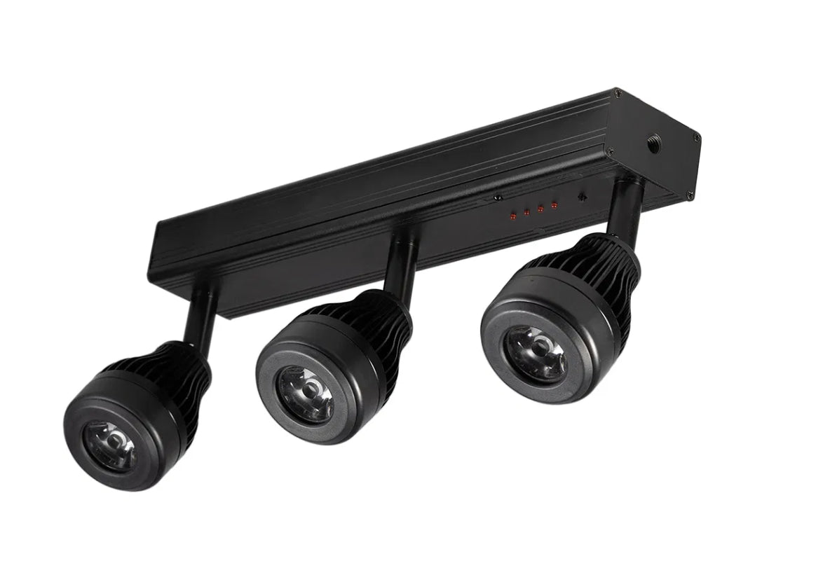 The Equinox Pinbeam Rapid features 3 individually controllable pinspots on a battery powered, compact bar. Each pinspot can easily be directed at displays for highlighting and pinspotting, whilst two optional lenses are supplied for beam adjustment (10° and 25°). The bar features multiple mounting options further adding to the versatility of this unit including an M10 threaded hole for a clamp, velcro straps for truss and strong magnets for attachment to ferrous surfaces. Four brightness modes and a maximum runtime of 8 hours on 100% output ensure this will keep you going through any event.