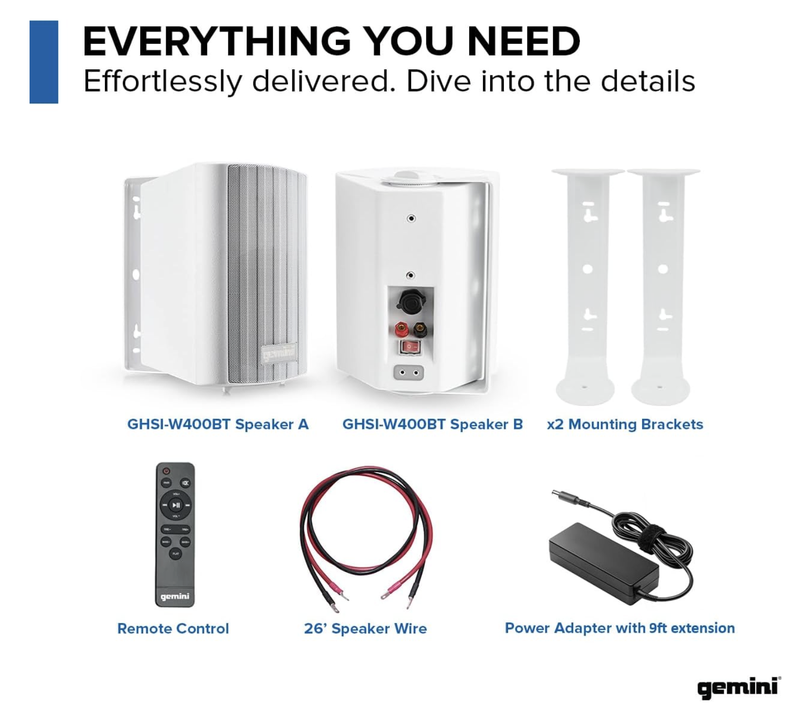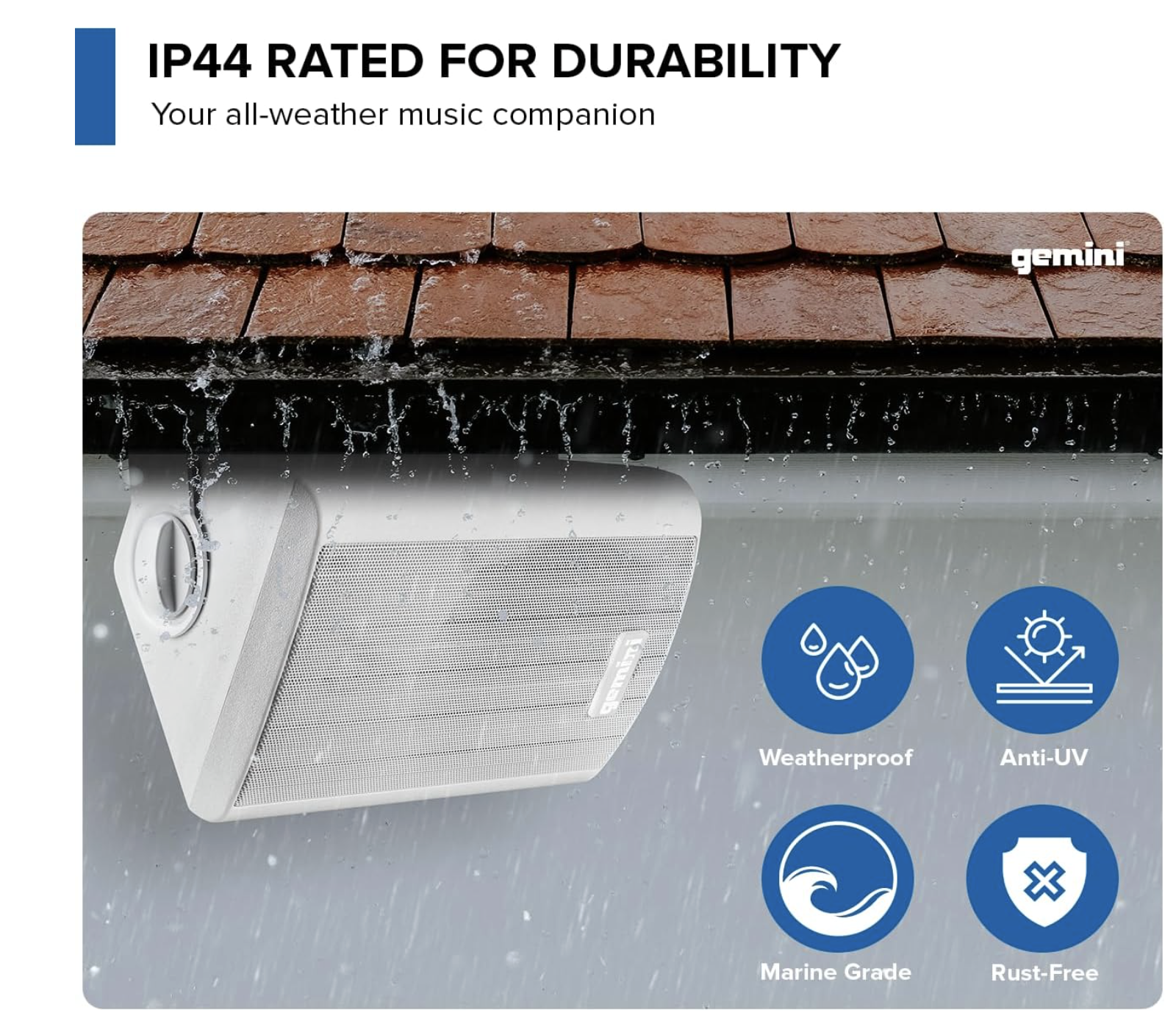 The Gemini GHSI-W525BT-PR-BLK is a pair of 5.25-inch outdoor Bluetooth speakers designed to provide high-quality sound for patios, gardens, or other outdoor spaces. These speakers deliver clear mids and crisp highs with balanced bass, ensuring consistent audio performance in open-air environments. The enclosures are made from rust-proof aluminum and feature an IP44 rating, offering protection against water splashes and dust for reliable all-weather use. Integrated Bluetooth allows wireless streaming from smartphones, tablets, or other Bluetooth-enabled devices, while wired connections provide compatibility with standard audio systems. The speakers are wall-mountable, providing flexible placement options, and their sleek black finish blends seamlessly into outdoor surroundings.