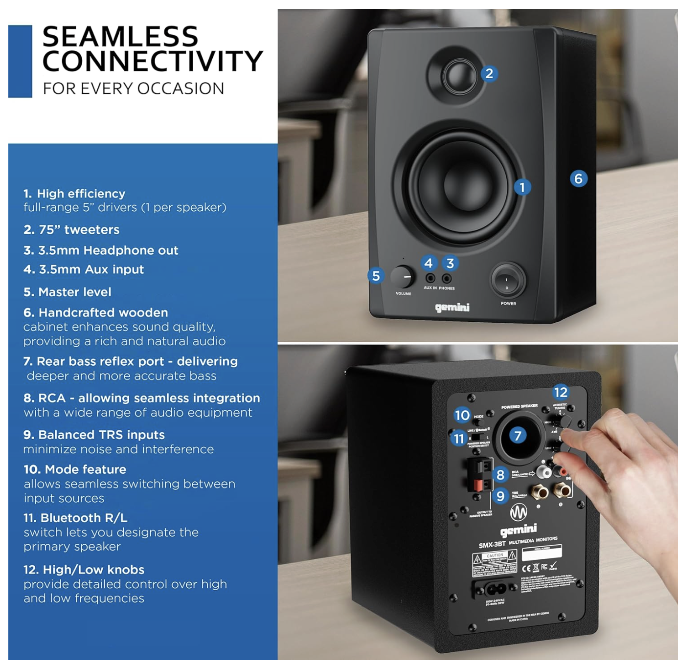 Experience powerful, versatile audio performance in a compact and stylish design with the Gemini SMX-3BT 100W Bluetooth Studio Monitor Speakers. Designed for home studios, desktop setups, and everyday listening, these bookshelf speakers deliver clear, balanced sound that works just as well for music production as it does for entertainment.