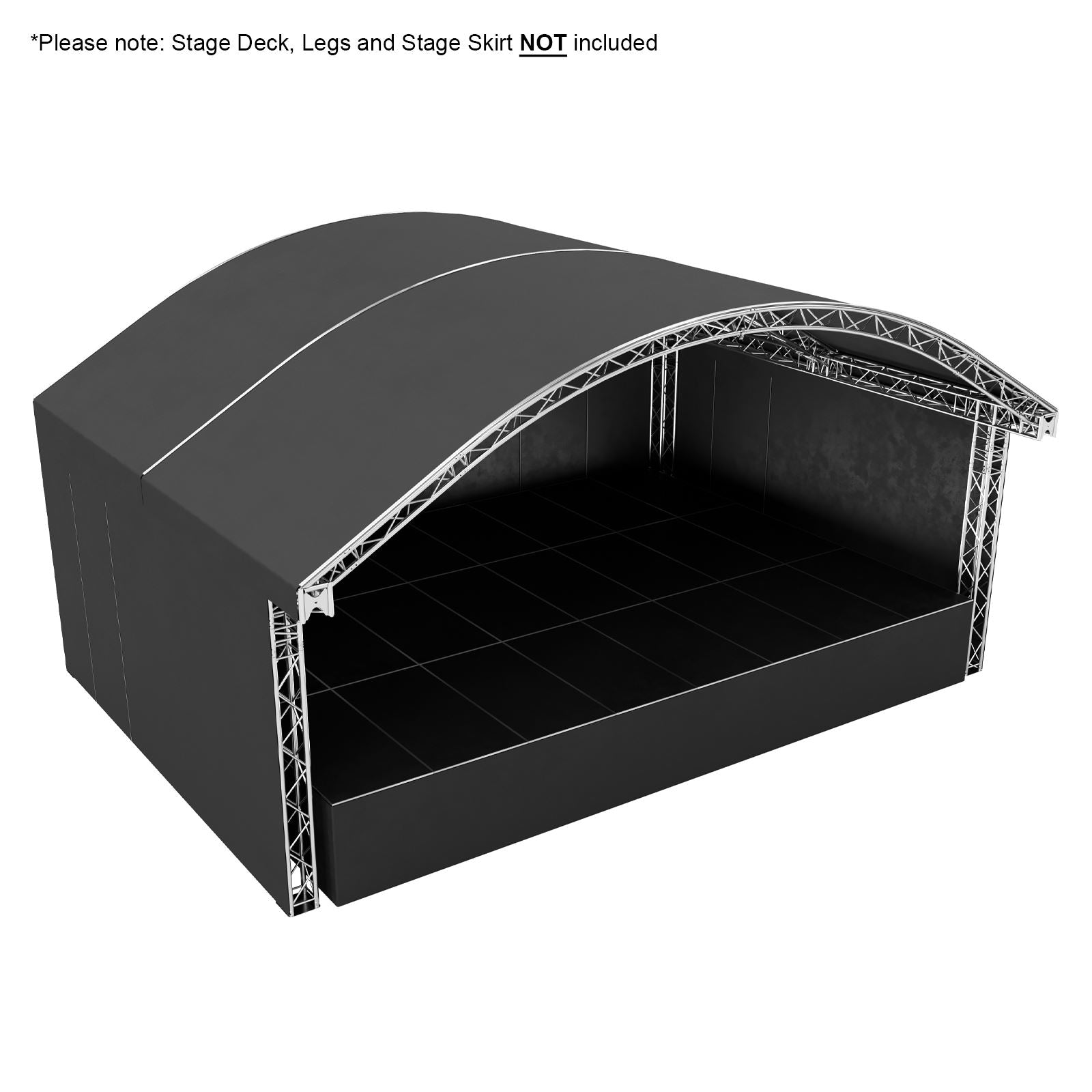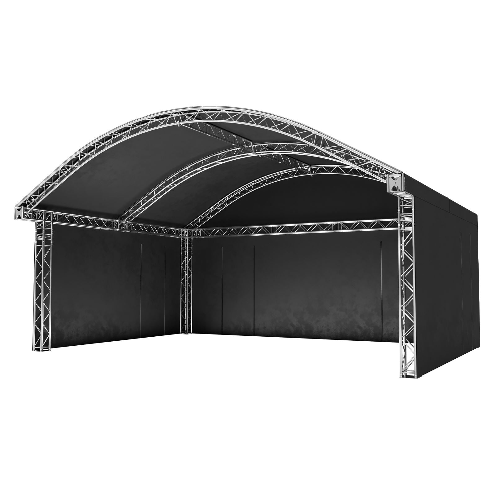 The round arch roof GT-RBB 8 x 6 is a quick and easy solution for small to medium sized events. The specially developed corner pieces enable the stage roof to be erected without further corner bracing and steel wires. The front corners are each equipped with a load bearing point for PA systems up to 250kg. In general, loads of up to 1400kg could be evenly distributed across the full system. All arch parts are equipped with a keder rail, which allows the roof tarpaulin to be inserted easily. The side panels are made of gauze with a total of 4 door cutouts. These panels can be taken down or rolled up and secured in the event of strong winds or other application where they are not required.