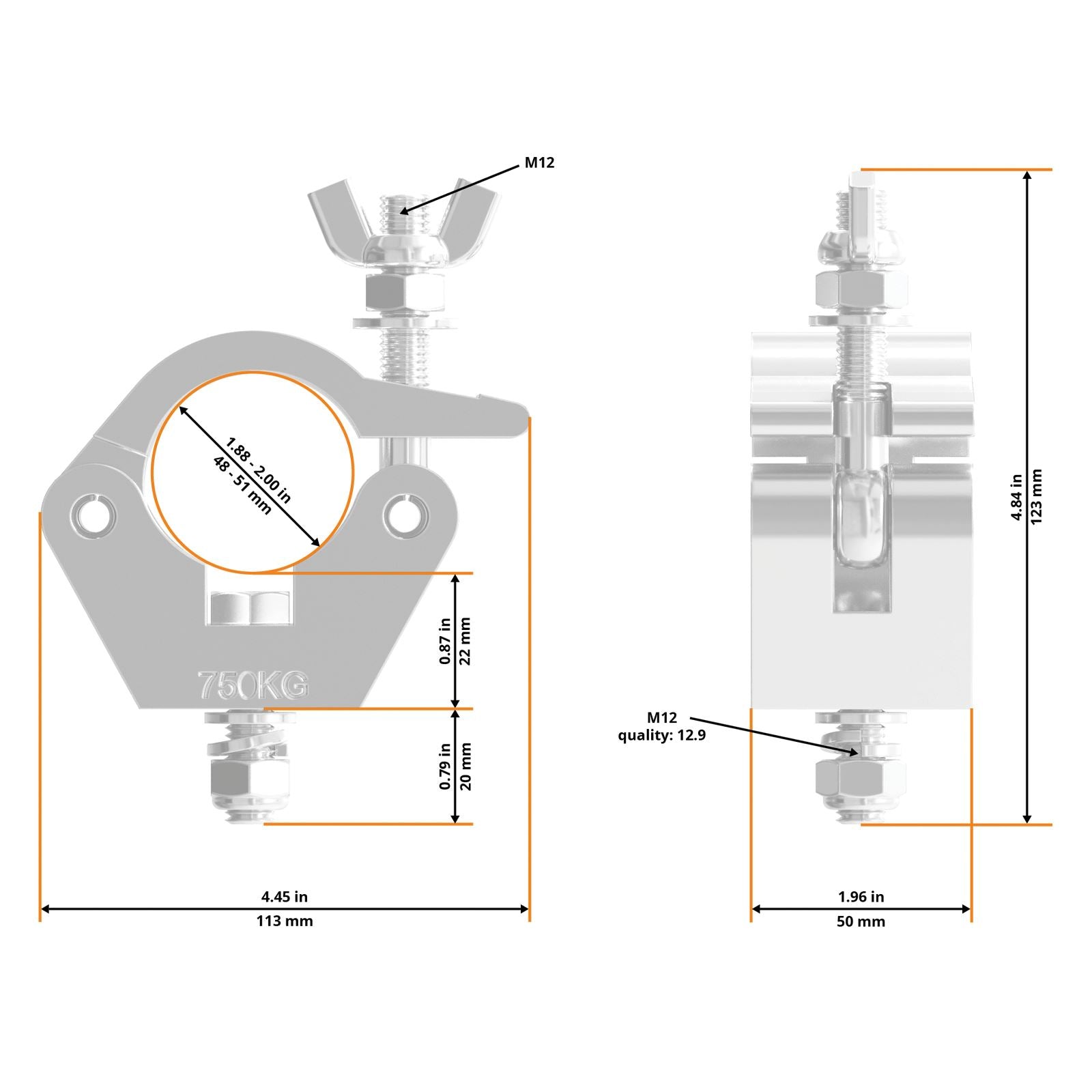 Featuring a width of 50mm and a load capacity of 750kg, this coupler is compatible with truss diameters between 48-51mm and is ideal for heavy loads. The fixture is secured by an M12 hexagonal self locking nut and bolt; the coupler clasp operates with an M12 wing nut.