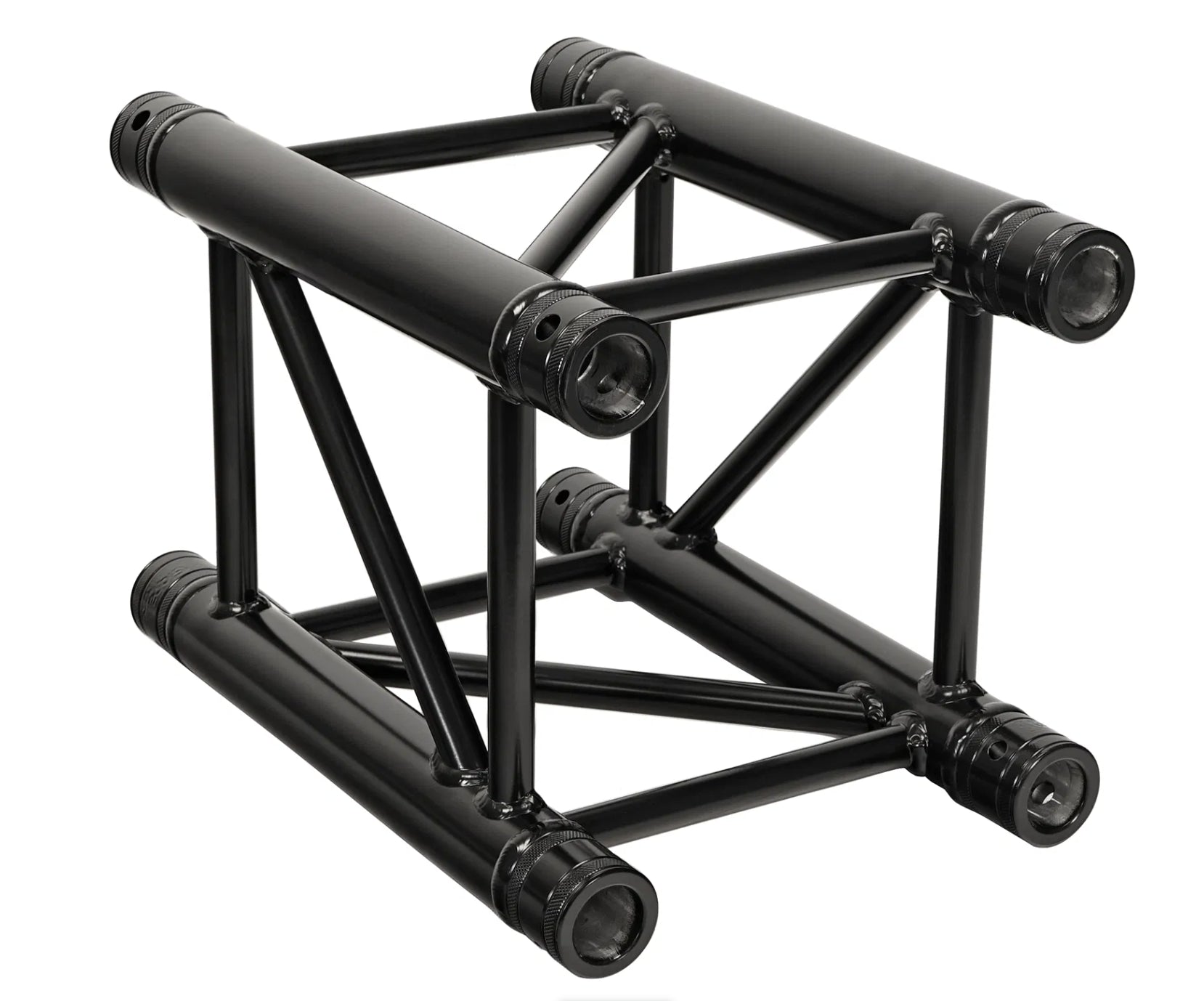 The F34 truss series by Global Truss is a 4-point system with an external dimension of 29cm. With its excellent load capacity relative to weight and size, the F34 system is one of the most widely used in the industry. From exhibition stands and shop fittings to stage roofs and outdoor structures, F34 truss offers versatility and strength. Constructed from 50x2mm main tubes and 20x2mm diagonal braces of aluminium, each section is supplied with conical connectors for secure assembly. This black powder-coated version provides a professional finish suitable for stage and event environments. The system can also be powder coated in any RAL colour on request. Please note this 0.42m length is not TÜV certified.
