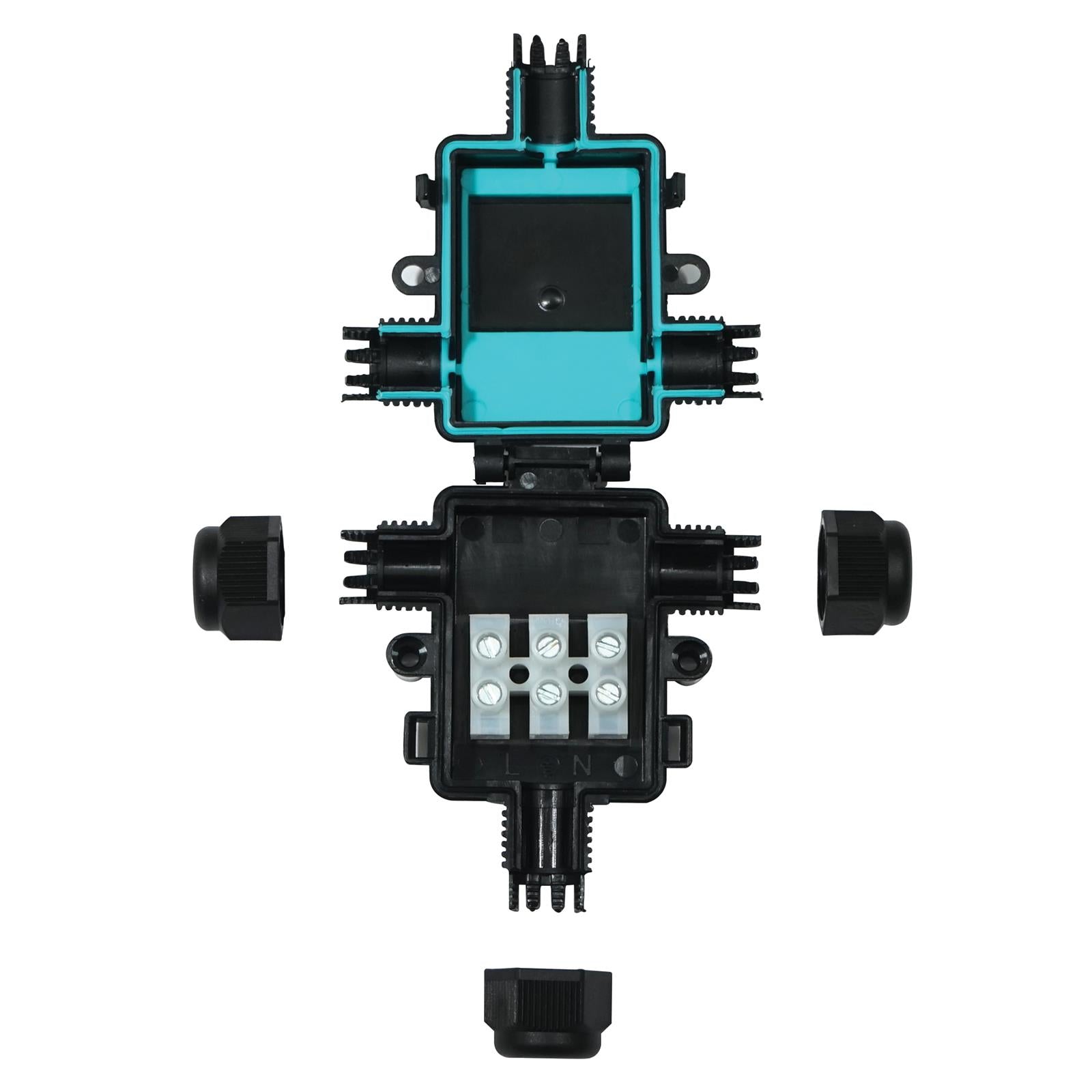 The THK200C2EF is a 3-way Junction Box / splitter suitable for internal or external uses. Accepting cables from 4 to 9.5mm diameter, the handy T shaped box supplied complete with three pole terminal block. The connection hinge between the top and the bottom simplifies the installation process.