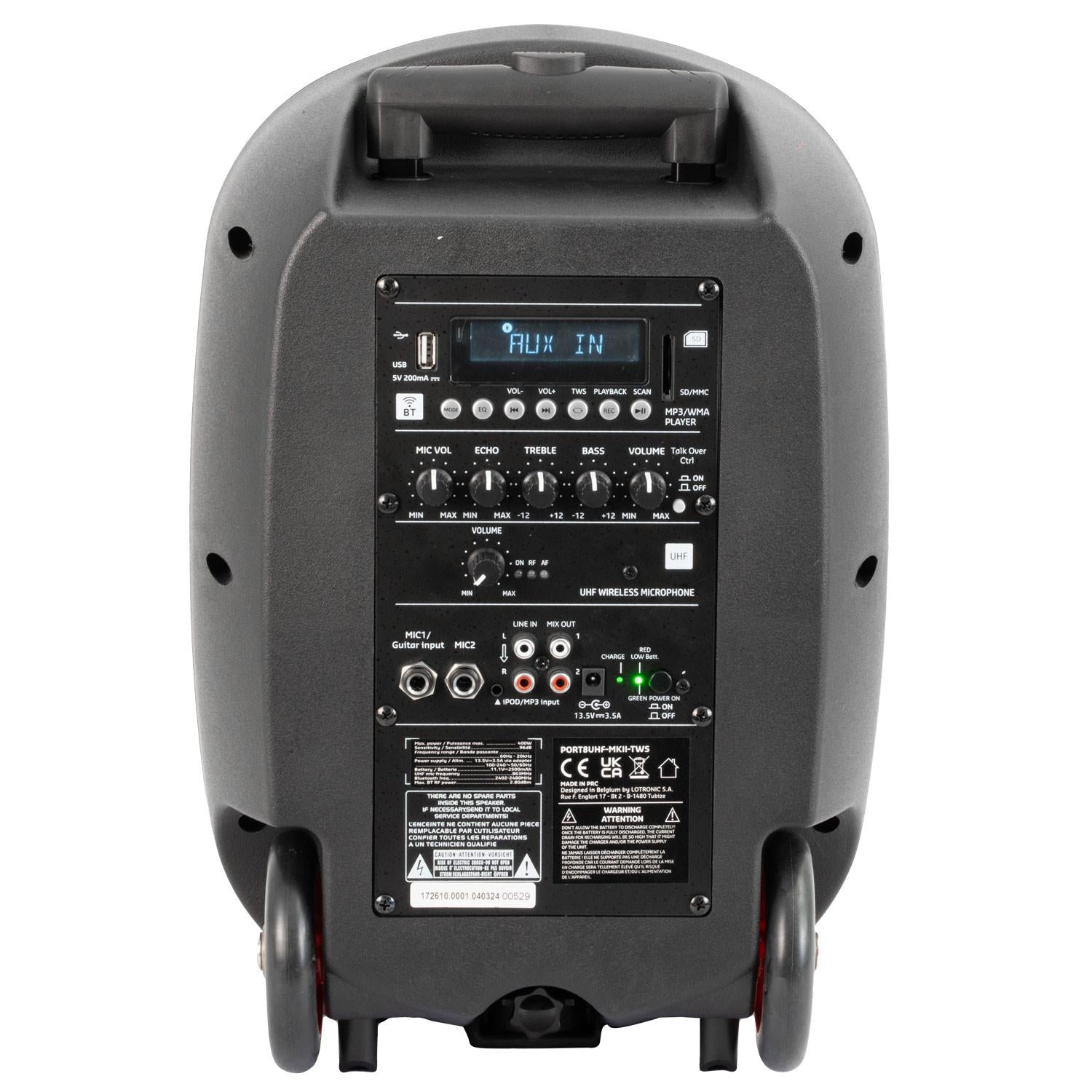 This portable sound system stands out by its exceptional sound quality. Fitted with a built-in rechargeable battery, it will run for more than 5 hours. The retractable trolley and poly-urethane wheels on ball-bearings allow you to take it with you wherever you go. A professional wireless UHF microphone as well as a remote control ensure optimal versatility and freedom of movement. The backlit display enhances even more its ease of use.This extremely versatile system is a precious assistant in many fields: sports associations, street dance, bars, terraces, performing artists and musicians in- and outdoors, speakers... Due to the numerous USB / SD / Line / Mic in- and outputs, the unit will cover all your needs and media.