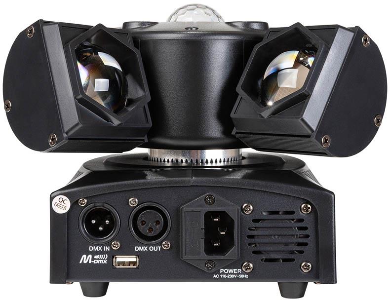 Installation is quick and simple, with comprehensive DMX control available for rotation, colours, strobe effects and more. Alternatively, you can rely on the excellent built-in programmes for ever-changing, ready-made light shows. The unit offers multiple operating modes: DMX-controlled via 1, 14 or 21 channels; standalone operation in either sound-activated or automatic mode; or standalone control using the included IR remote. For larger setups, several units can be connected in master/slave mode to produce beautifully synchronised shows.
