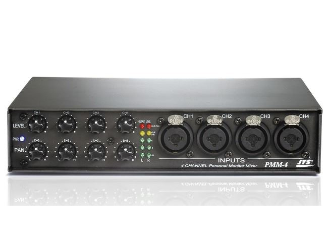 The PMM-4 is ideal as a compact personal monitor mixer for meeting rooms, Houses of Worship, broadcast and educational public address systems. Four inputs with XLR 1/4Â phone jack combo connecter. It has two additional auxiliary inputs and four XLR split outputs.