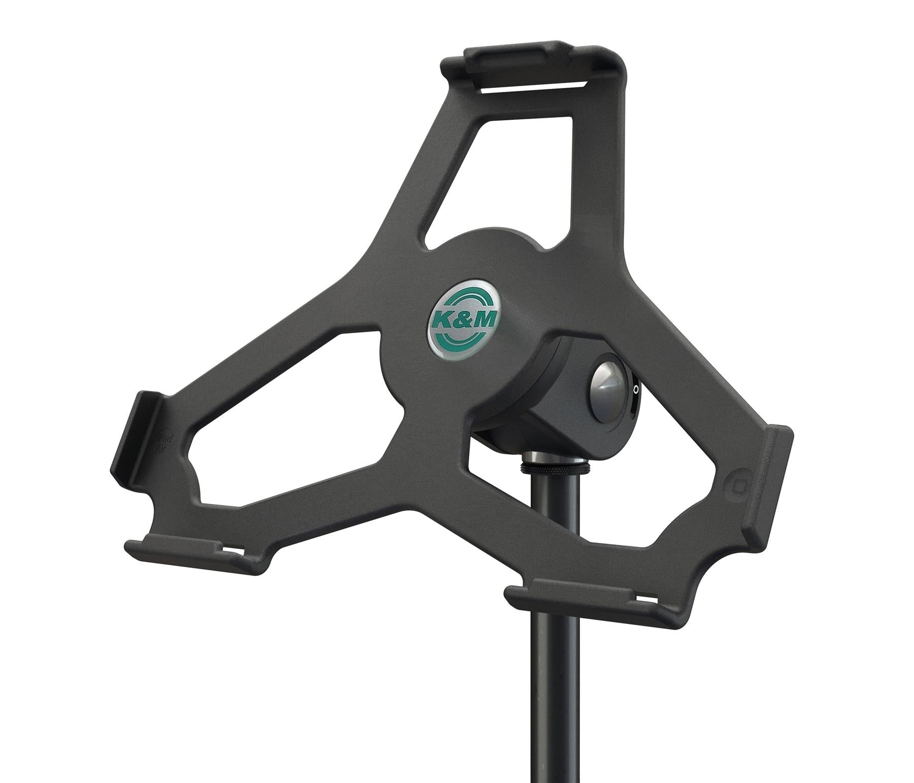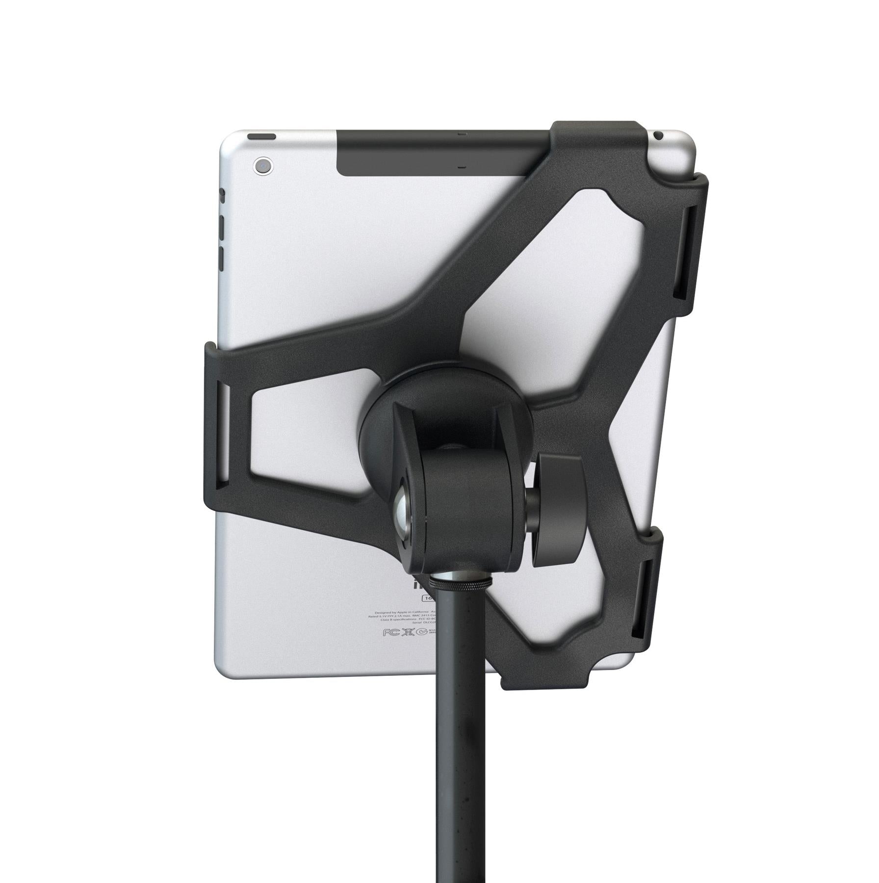 For the iPad (Air 2 or Pro 9.7”) the holder can be attached to any microphone stand. The iPad is clipped in and out effortlessly. A wing nut adjusts the tilt. The iPad switches between the vertical and horizontal format without slipping.