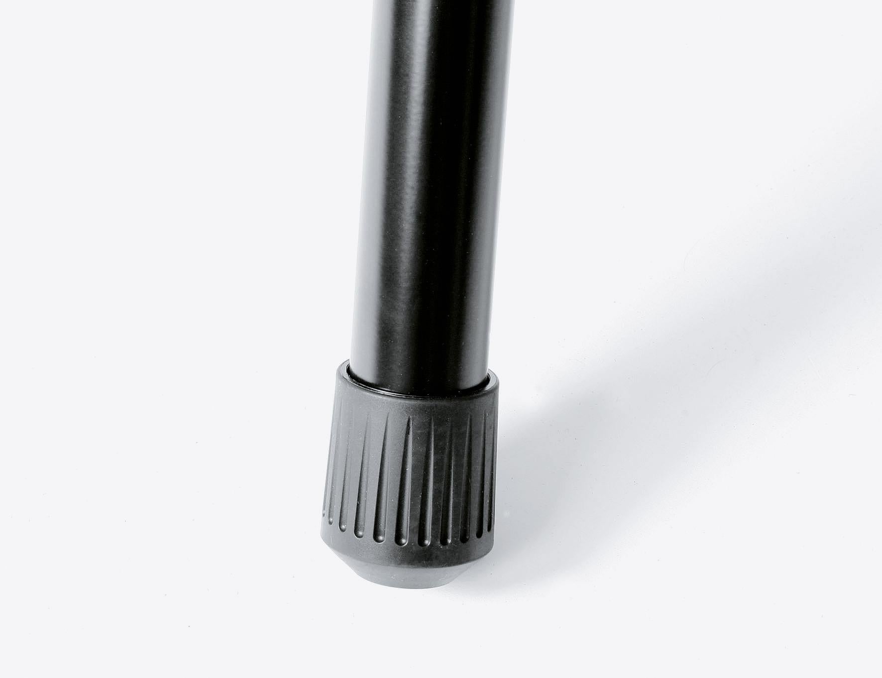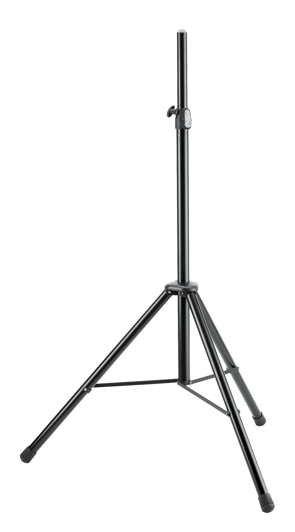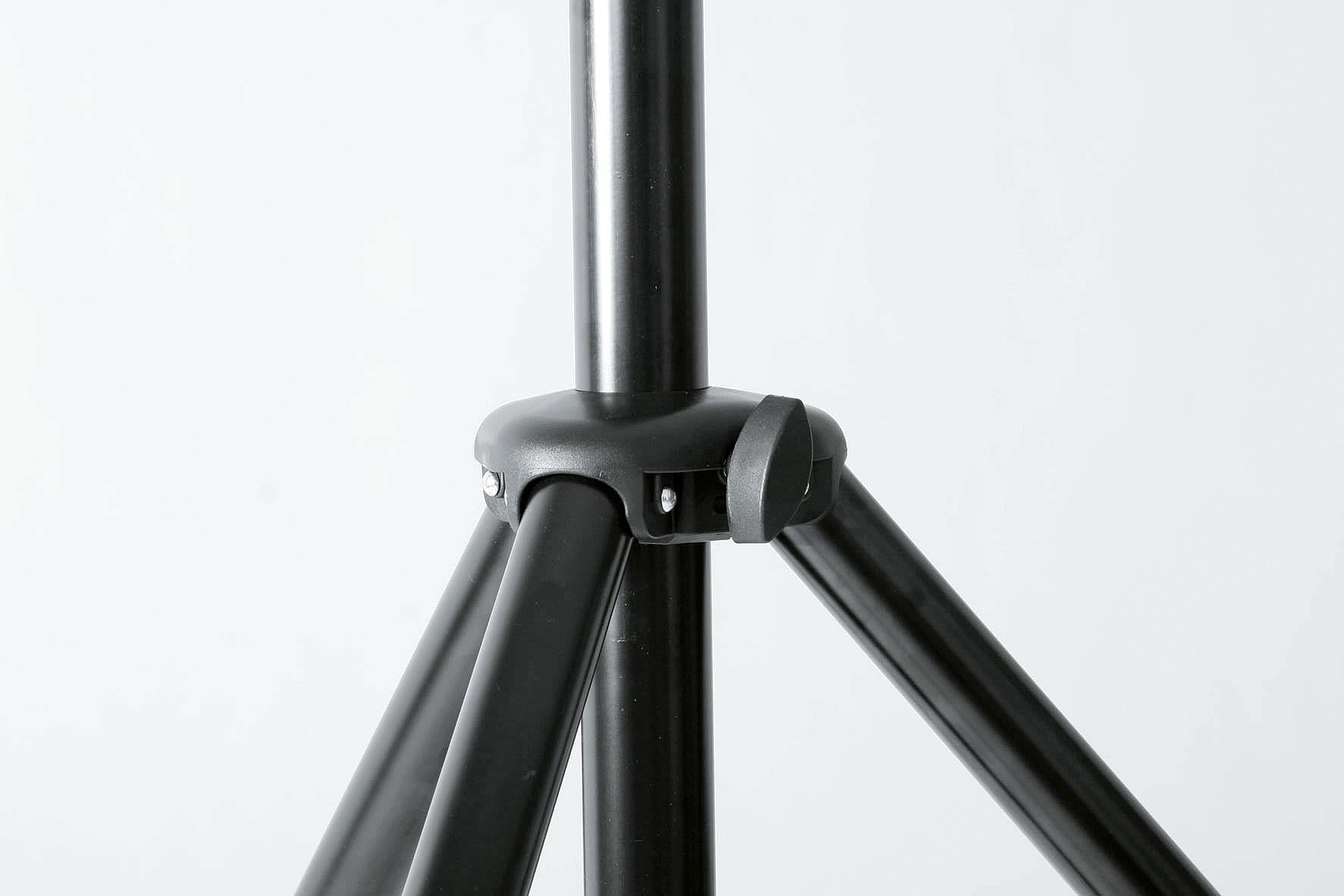 Speaker stand constructed from lightweight aluminium tubing. Lasered bore holes and plastic washers improve the friction between the legs and braces and prevents scratching. A clamp with a patented push-button system gives easy height adjustment. Additional features include a pull-out guard for the extension tube, mounting aid and an anti-shock component.