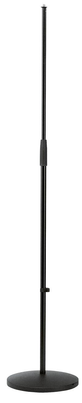 Sound-absorbing cast-iron base and straight microphone stand with black powder-coated screw-in rod, 3/8" thread. Height adjustable stand. 2-piece telescopic design.
