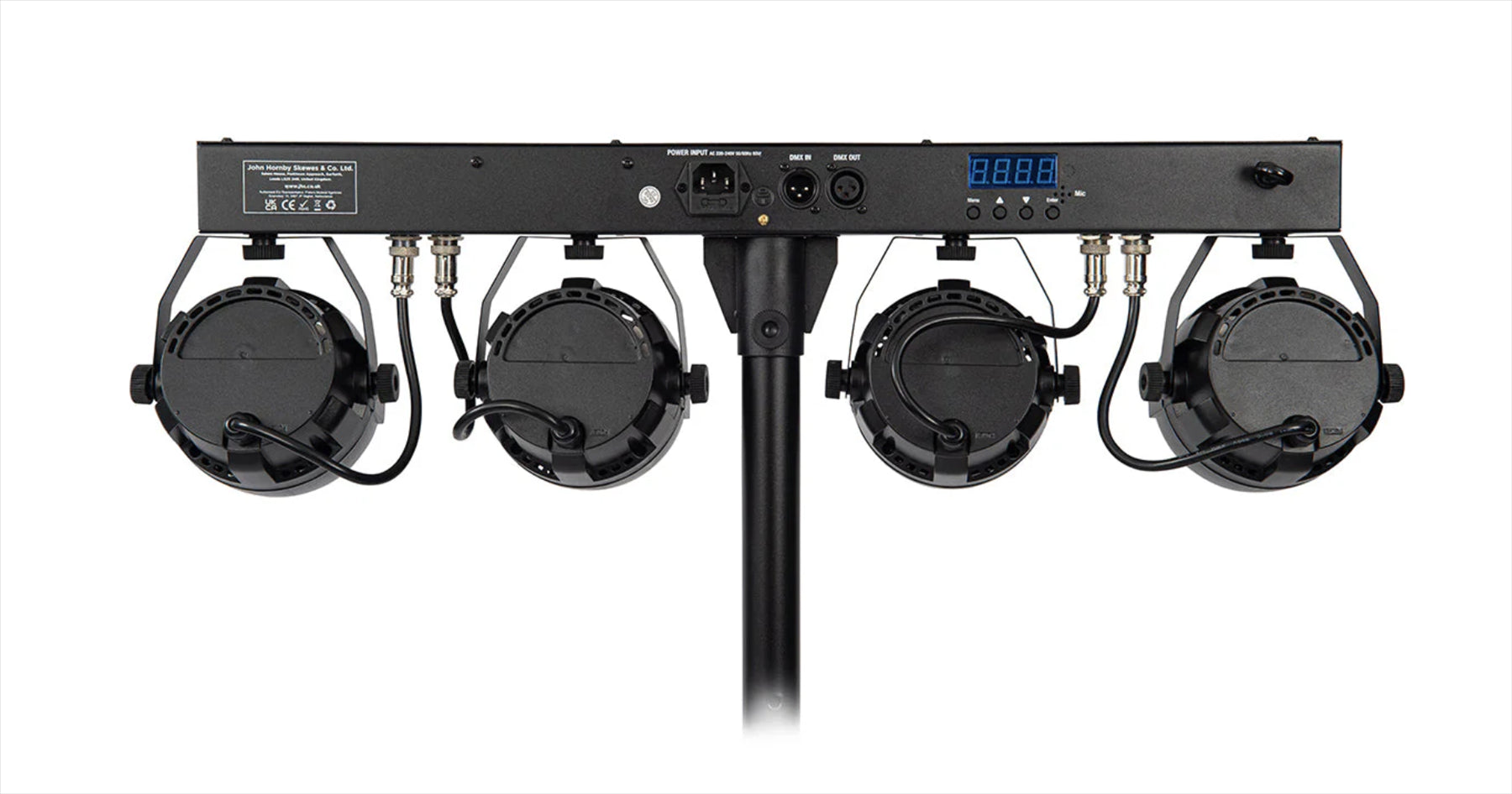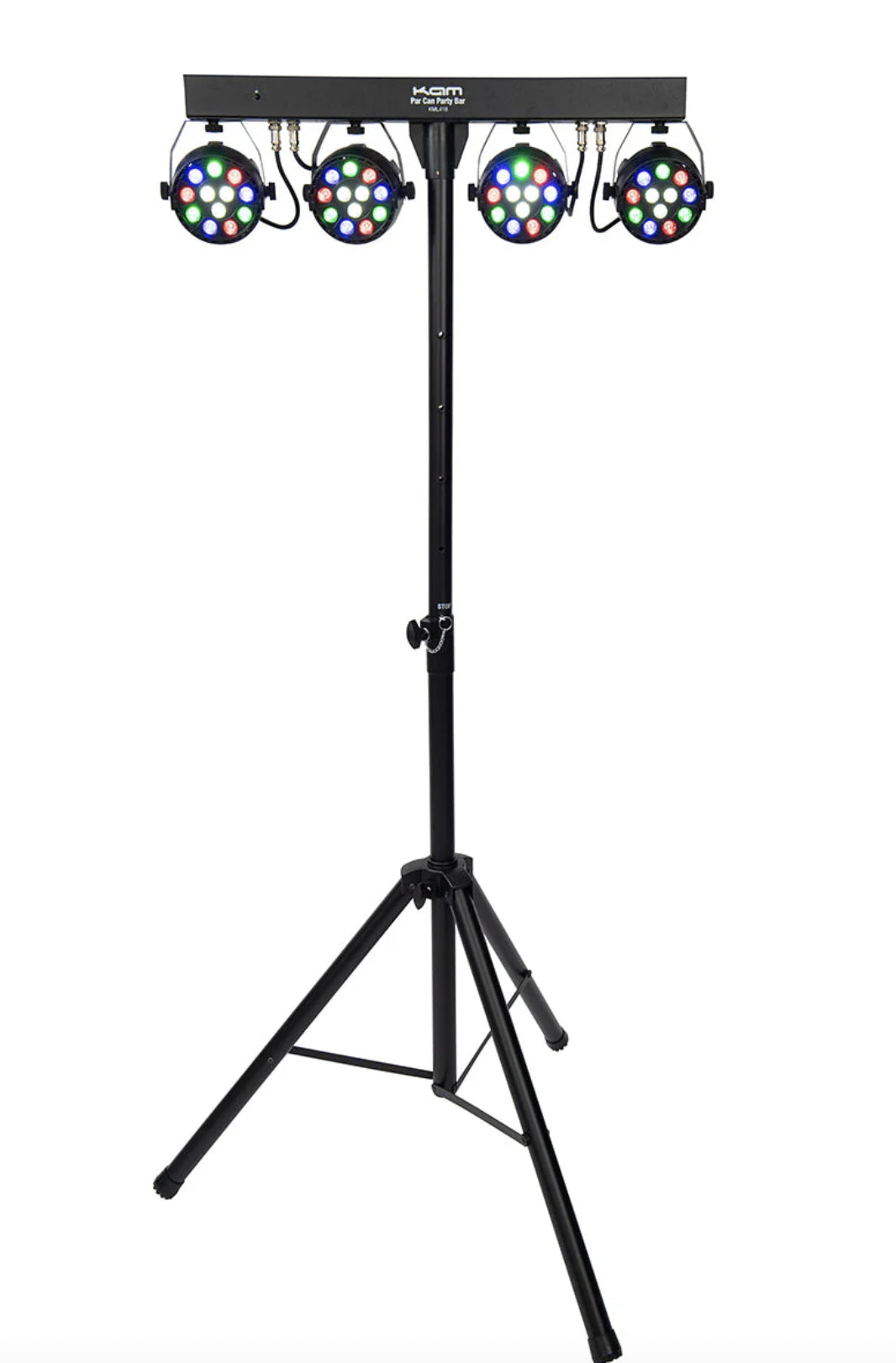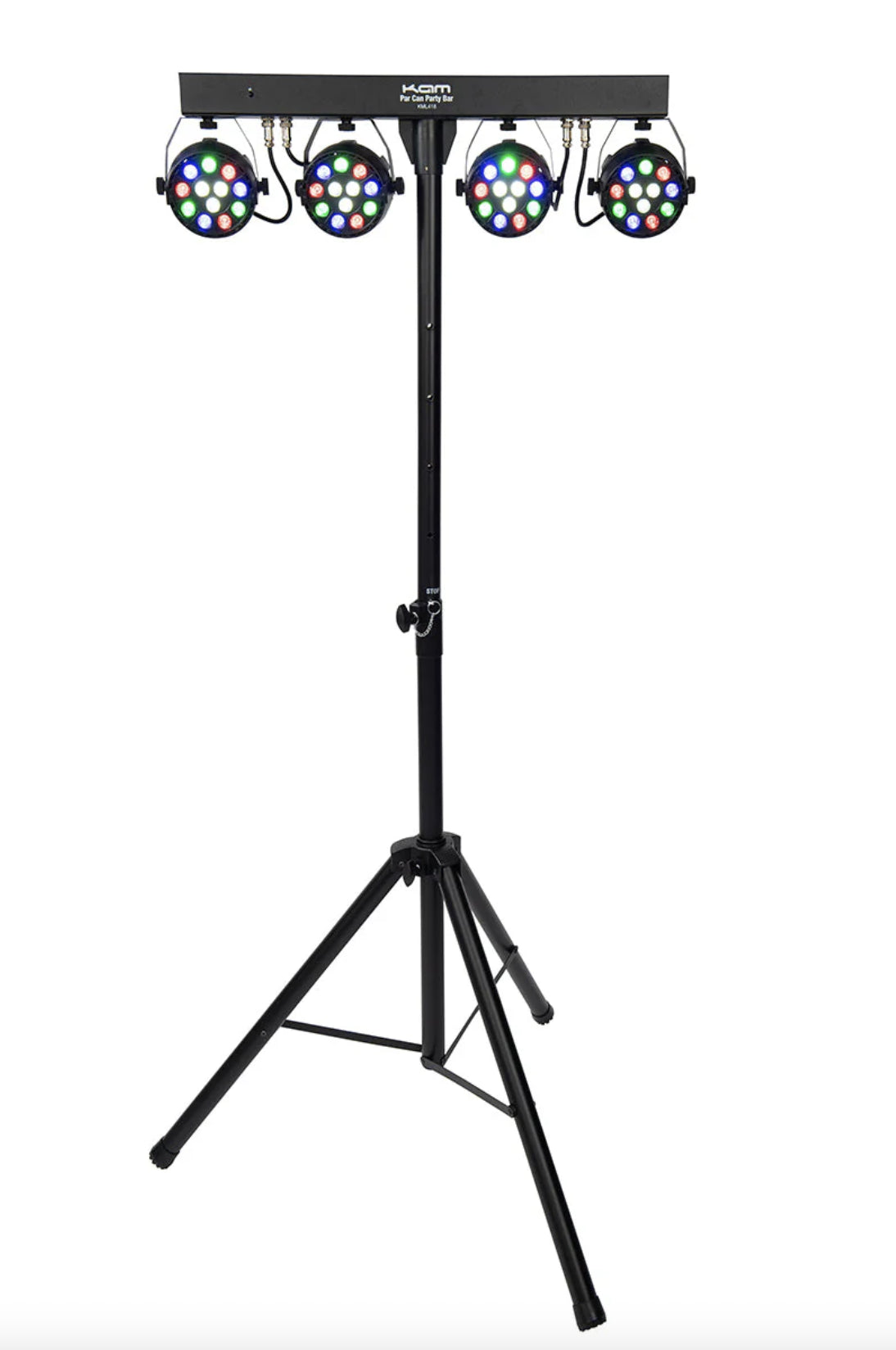The Kam Partybar Eco is an all-in-one LED lighting package that is suitable for parties and portable applications alike. Featuring four par cans with twelve 1W RGBW LEDs per unit, the Partybar Eco offers smooth colour mixing and spectacular multi-colour wash effects. Supplied with a control bar, a tripod stand and a remote control, the Kam Partybar Eco delivers convenient setup and user-friendly operation.