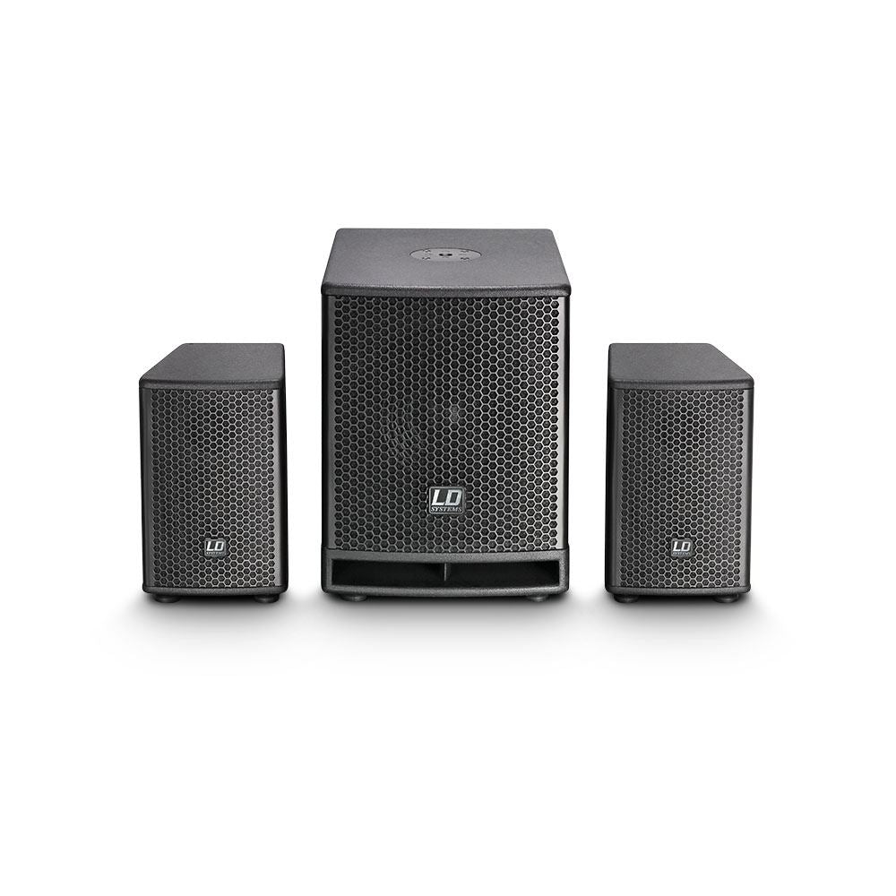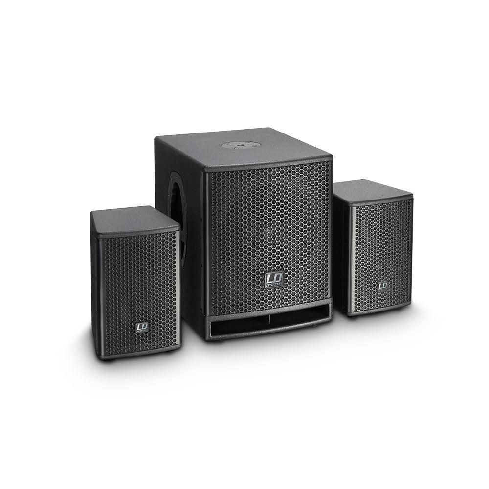 The LD Systems DAVE 10 G3 is the latest generation of an extremely compact active PA system. The bass reflex subwoofer provides a solid bass foundation; the satellites ensure clearly defined mids and clear treble. The 2.1 power amp module built into the subwoofer delivers 1400W Peak power, and the intelligent LD LECC DSP guarantees perfect interaction and controlled functioning. The digital signal processor includes specially optimised crossovers, separate equalisers and limiters for the bass, mid, and treble frequency ranges, and a dynamic compressor that controls the subwoofer according to volume and provides for increased punch at low volumes.