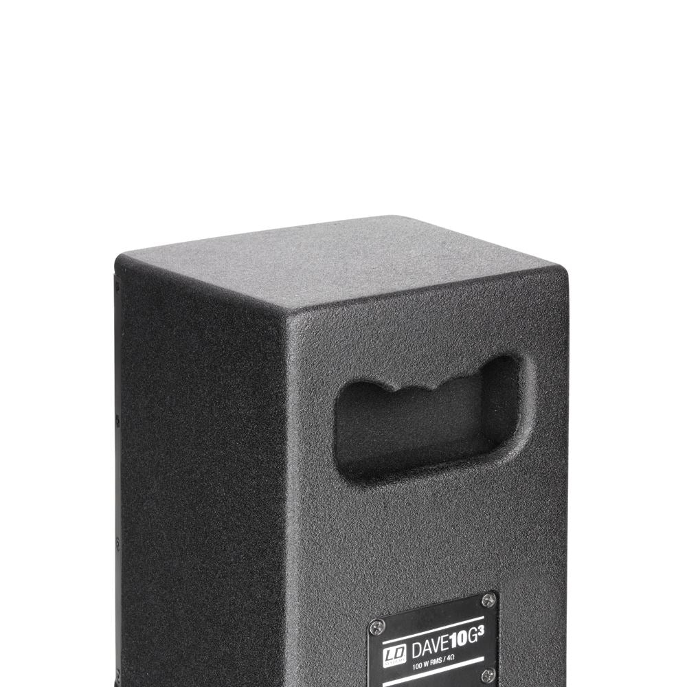 The DAVE 10 G3 system's professional features include sturdy MDF cabinets, the necessary protection circuits, RCA, XLR/jack combo and Speakon-compatible connectors, and ergonomic handles. The LD "Evolutive" handles of the subwoofer are a genuine innovation - they permit a trouble-free, secure grip from all sides! The stand support of the satellites is tilted by five degrees for perfect orientation of the speaker cabinet.