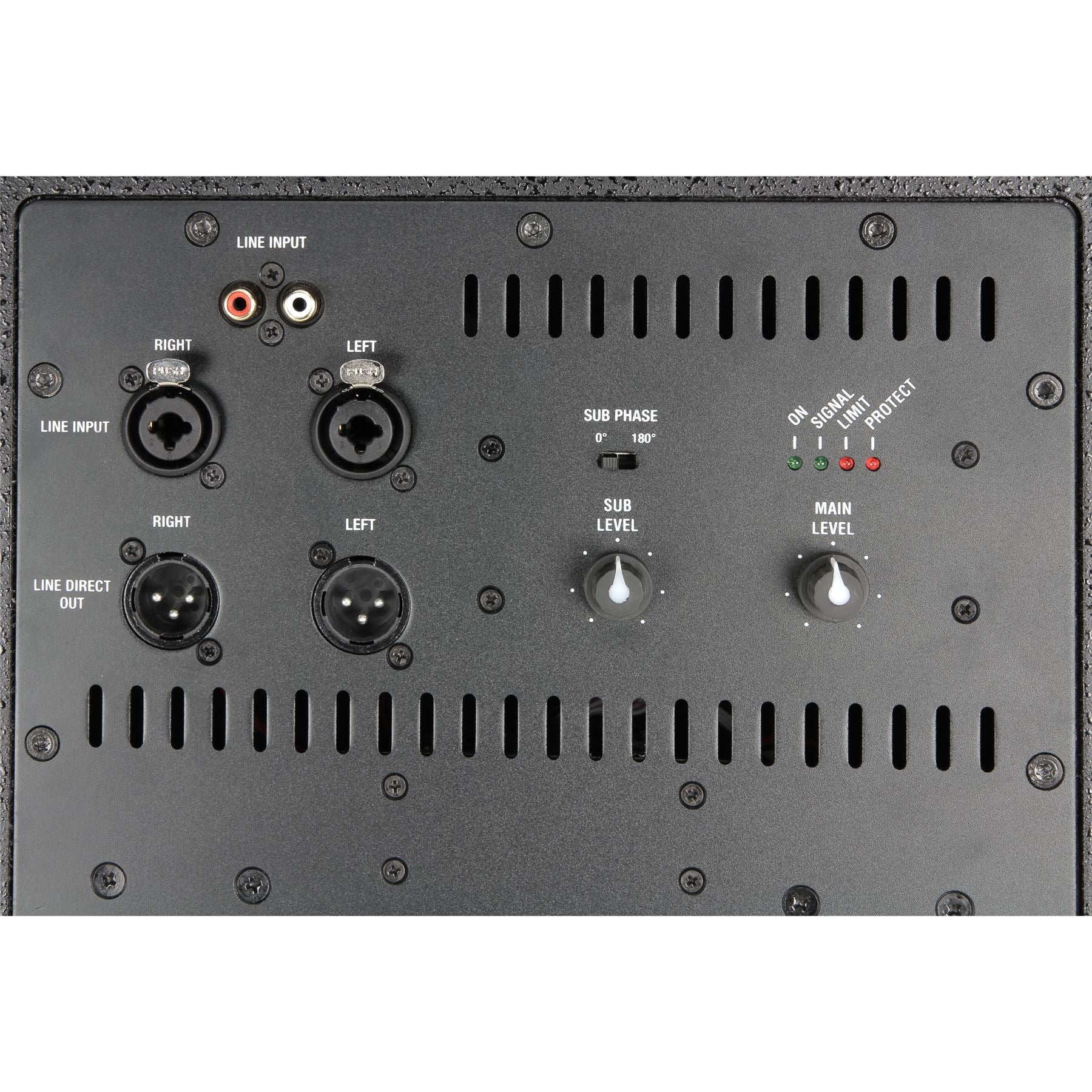 Controls: Main level, Power, Sub level, Subwoofer Phase Reverse