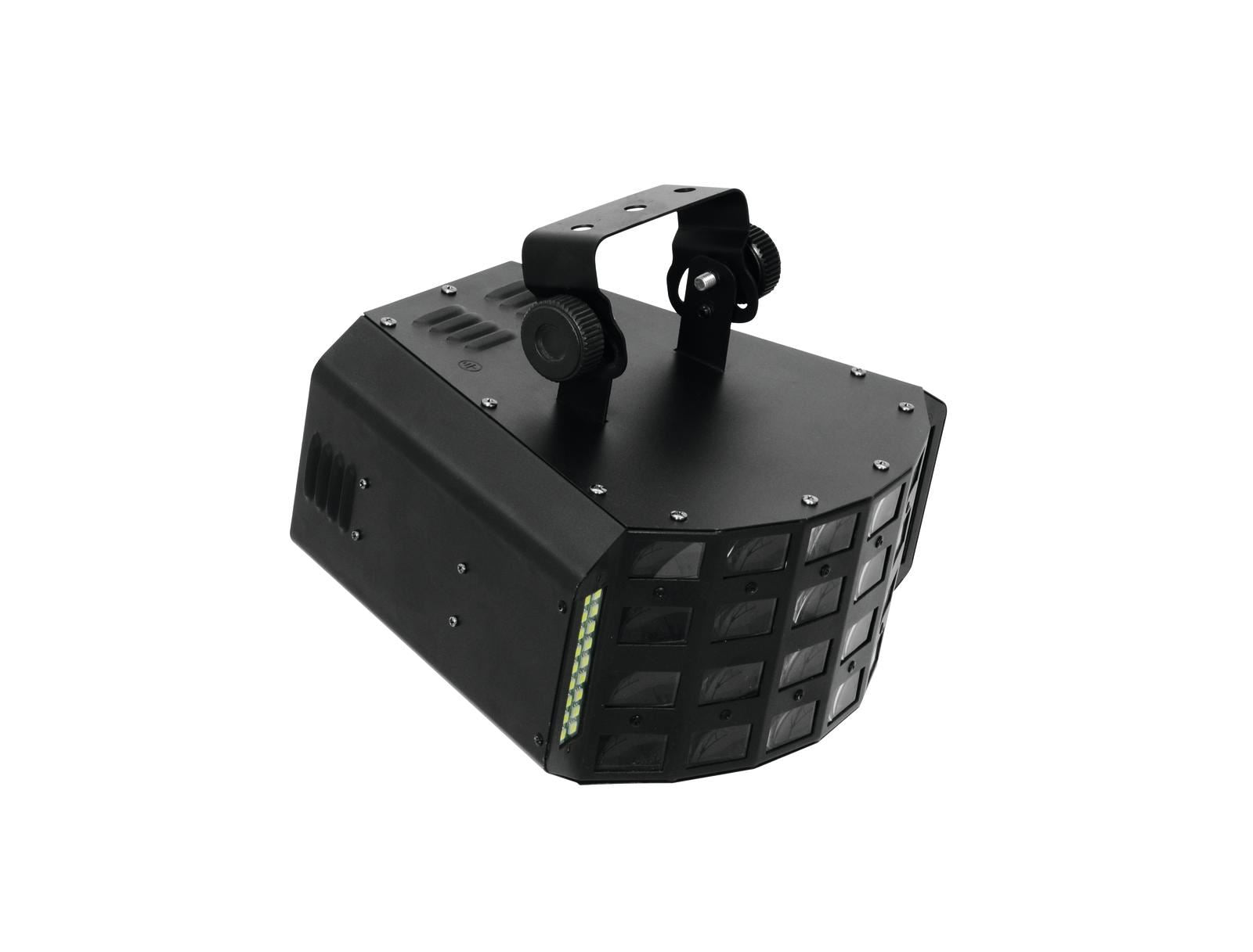 DMX lighting effect with RGBAWP derby, white strobe LEDs, and IR remote control