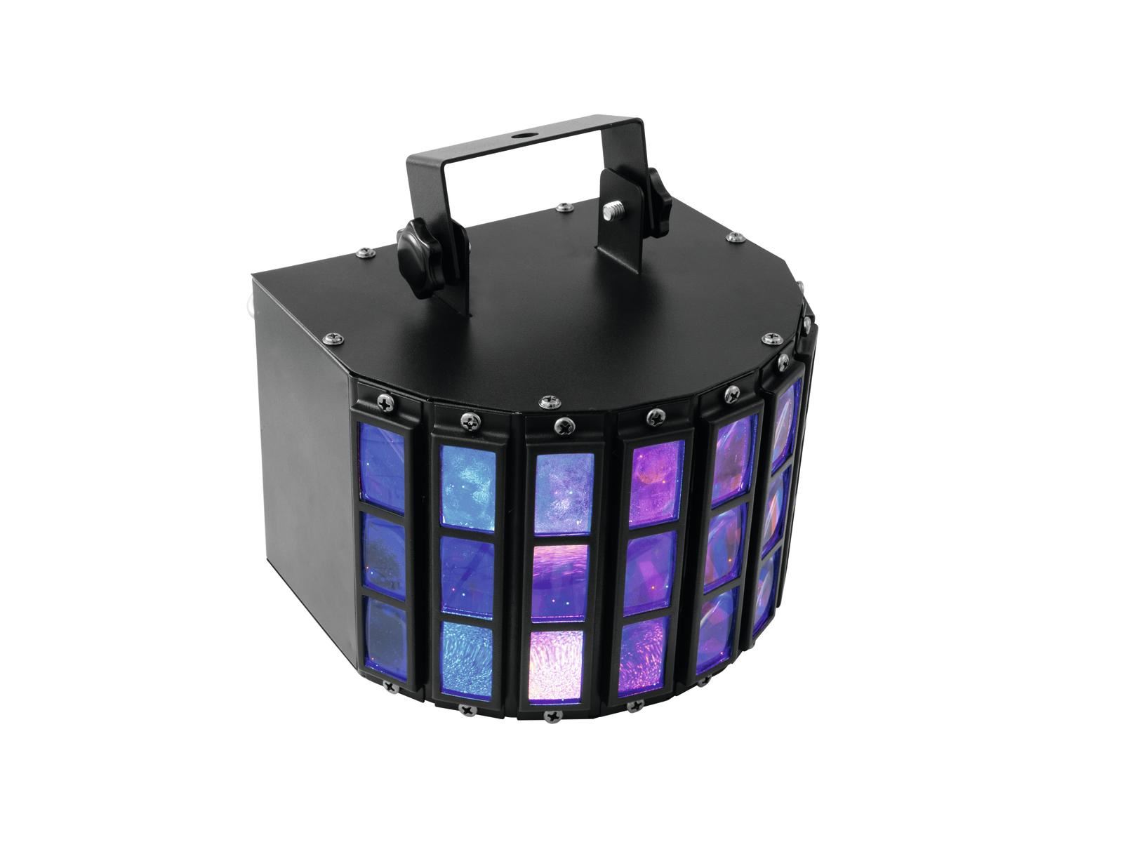 With its extra-bright beams in three different colors and white, this hybrid beam effect cuts even through the dense air in a club, home party room etc.A semicircular arrangement of RGBW LEDs allows for light shows of any kind. The fixture contains a preset program in an infinite loop which can be played either in automatic or sound-controlled mode via the built-in microphone. If you choose the latter, the rhythm of the music sets the tone for the color changes - this works for both fast and slow genres.Since the Mini D-5 by Eurolite is a particularly light and small spot, you can easily take it with you and use the mounting bracket to install it almost everywhere you like. Of course, the power cord and plug are included so you get everything you need for your color explosion in one compact set!