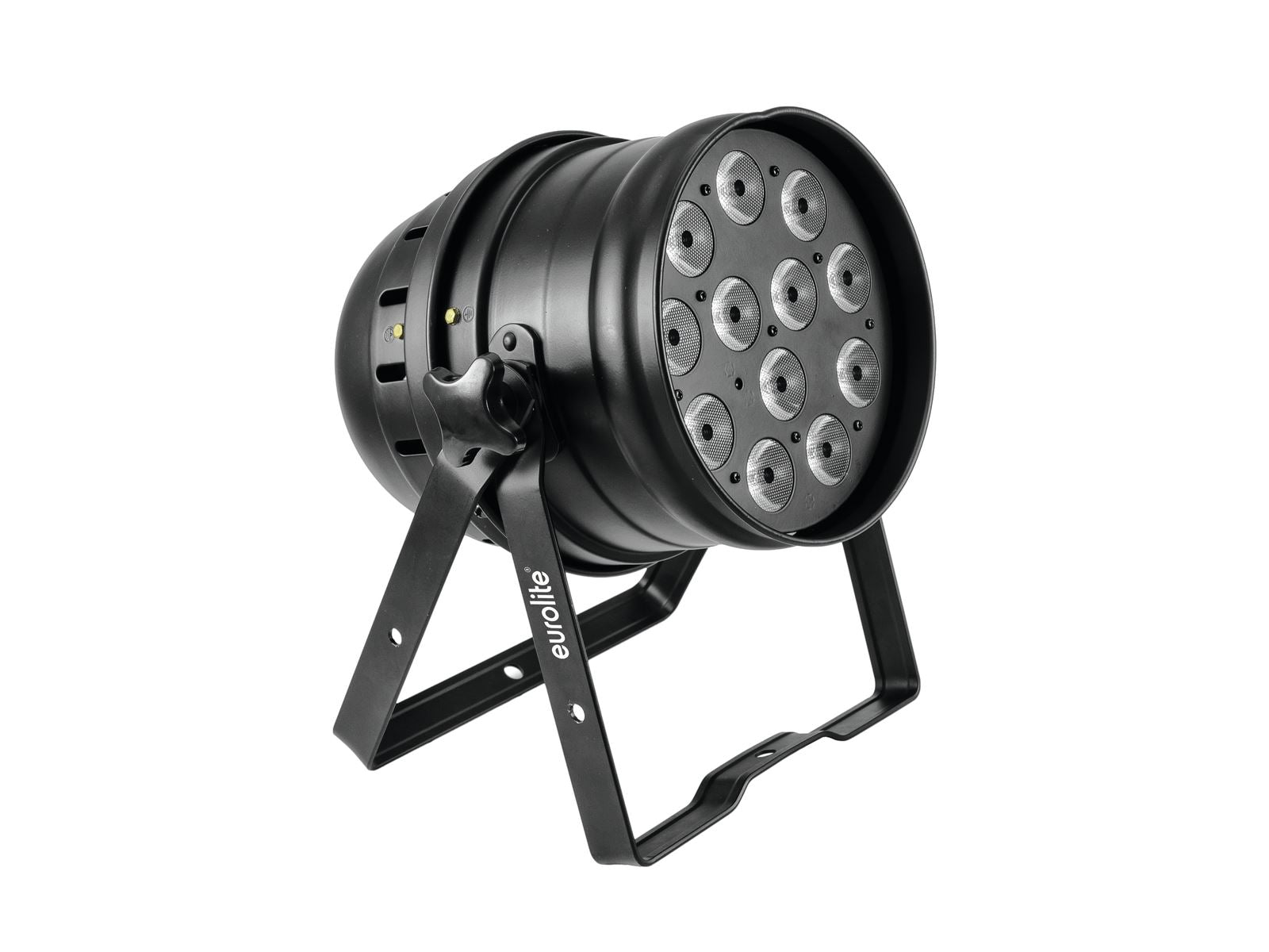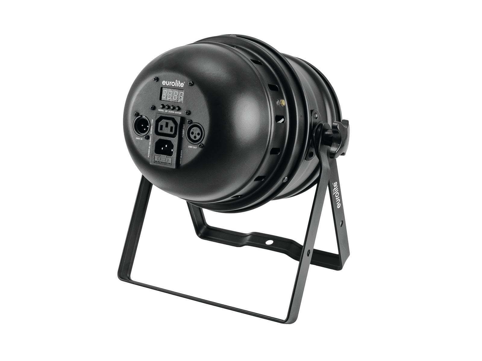 PAR spotlight with RGBW color mixing incl. remote controlThe Eurolite LED PAR-64 is equipped with 12 powerful RGBW-LEDs (4in1) of 8 Watt each. You can use it on stage, in the club lighting area or as a floor spot, thanks to its additional bracket for placement. The color temperature of the white tone is adjustable in six steps, the RGBW color mixing is stepless. 24 colors can be selected directly. The spotlight has a dimmer and strobe effect. The effect spot can be controlled via DMX, standalone or via music control via the built-in microphone with adjustable microphone sensitivity. In auto and music mode you can play the integrated show programs. Addressing and settings are possible via a control unit with four-digit LED display. Up to eight devices can be easily interconnected using the existing IEC mains connections. The Eurolite LED PAR-64 can be easily remote controlled with the supplied infrared remote control.