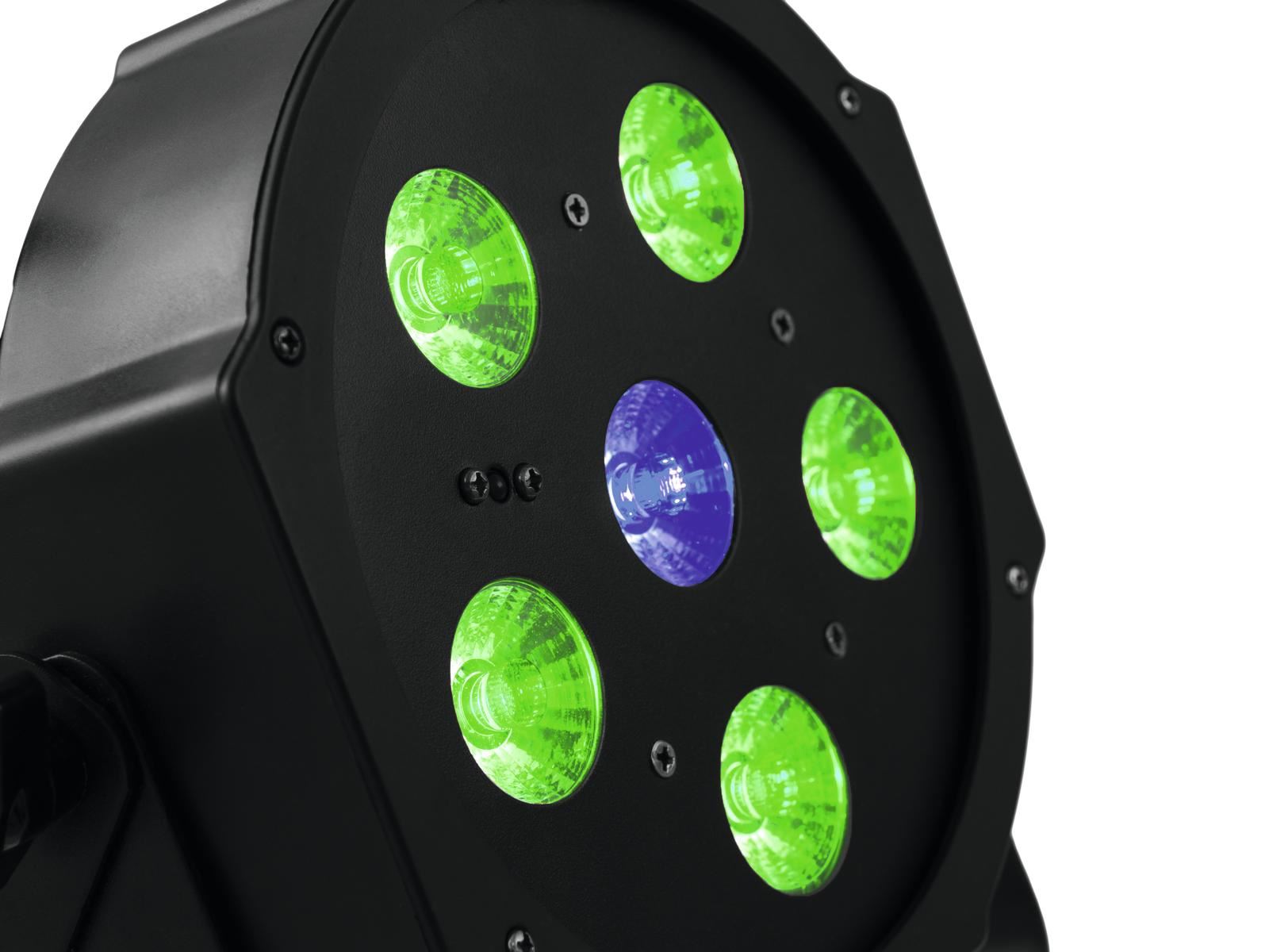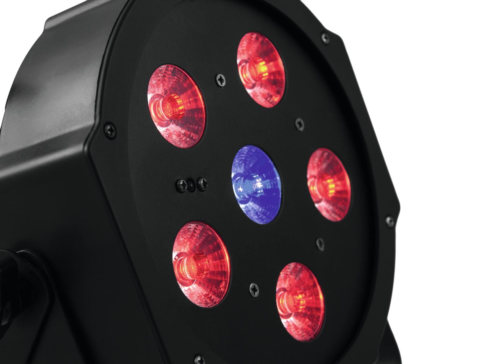 Flat spotlight with 5 x 3 W 3in1 LED (RGB) & one 3 W UV LED, incl. IR remote control