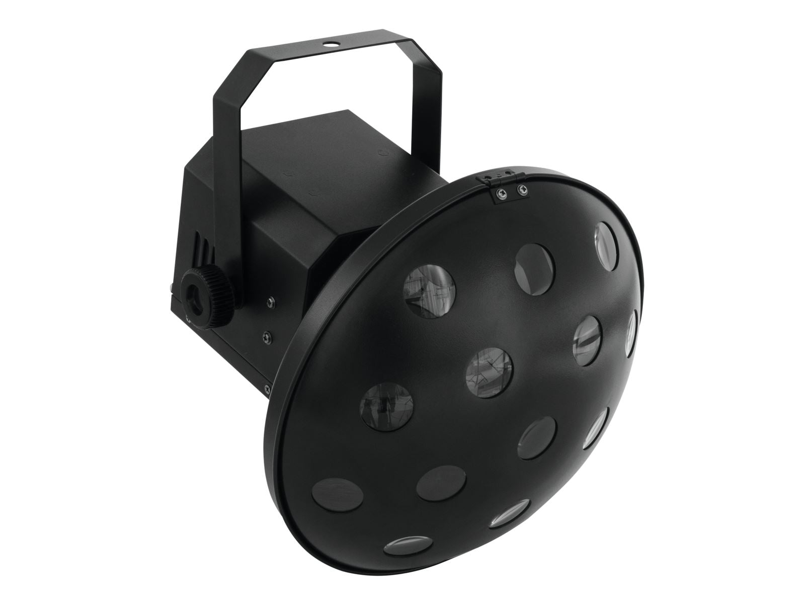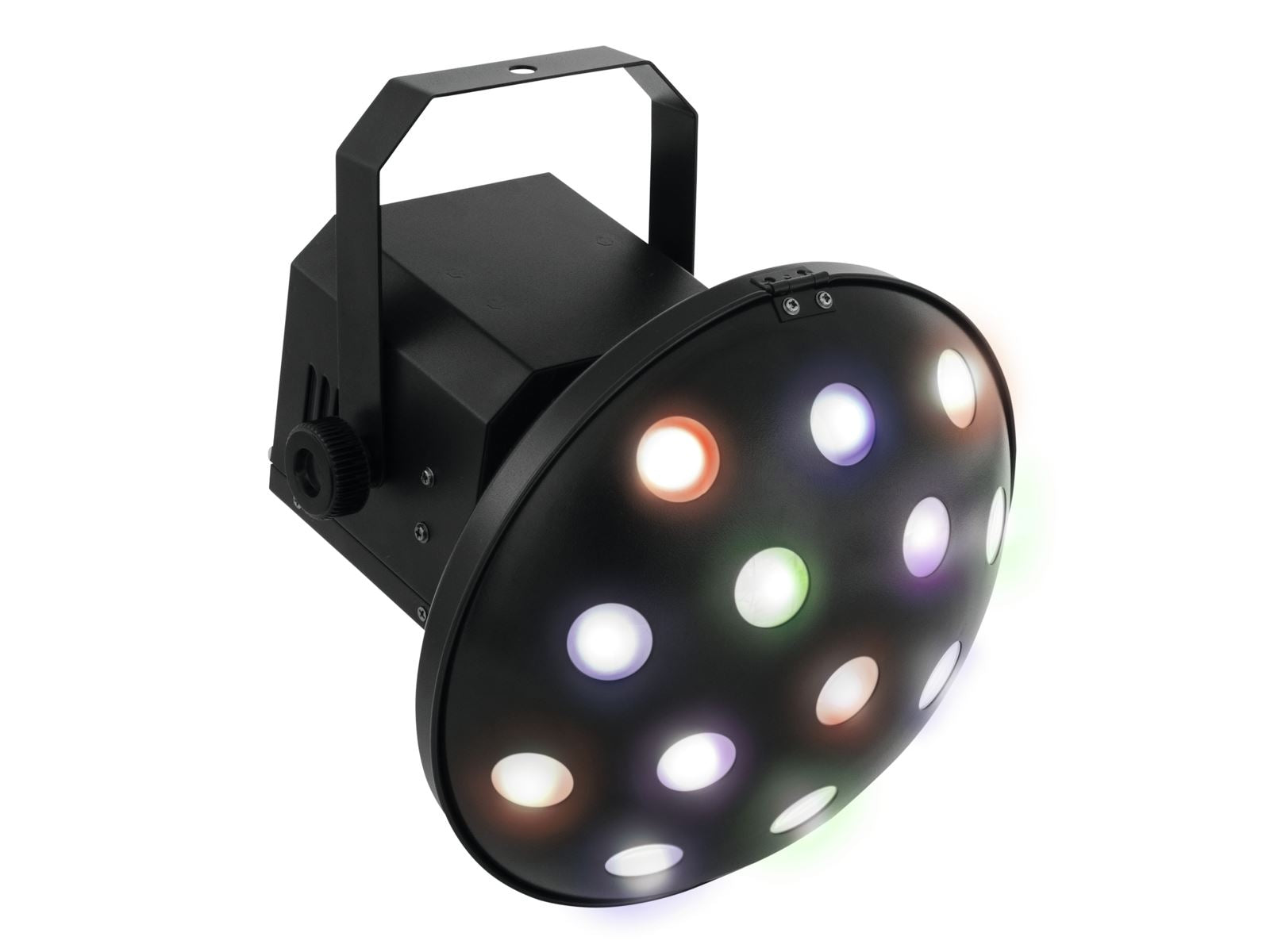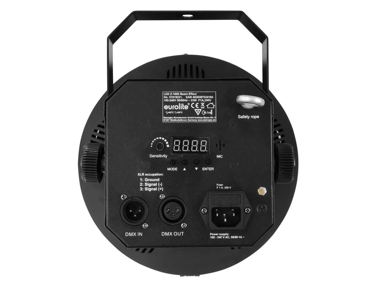 Mesmerizing light show in 6 beautiful colorsEquipped with six 3-watt LEDs in the colors red, green, blue, amber, white and pink, the LED Z-1000 mushroom effect by Eurolite offers razor-sharp colorful beams in the following operating modes:You can either select one of 9 preset show programs or let the rhythm of the music set the tone for your light show. As a third option, you can also connect a DMX controller (the fixture occupies 10 DMX channels). Instantly ready to useOf course, the LED Z-1000 is delivered ready to use with plug and power cord. With a low power consumption of only 23 watts and around 2 kg weight, the LED Z-1000 is an exciting, inexpensive beam effect for mobile DJs, clubs, bars and party rooms of any kind.