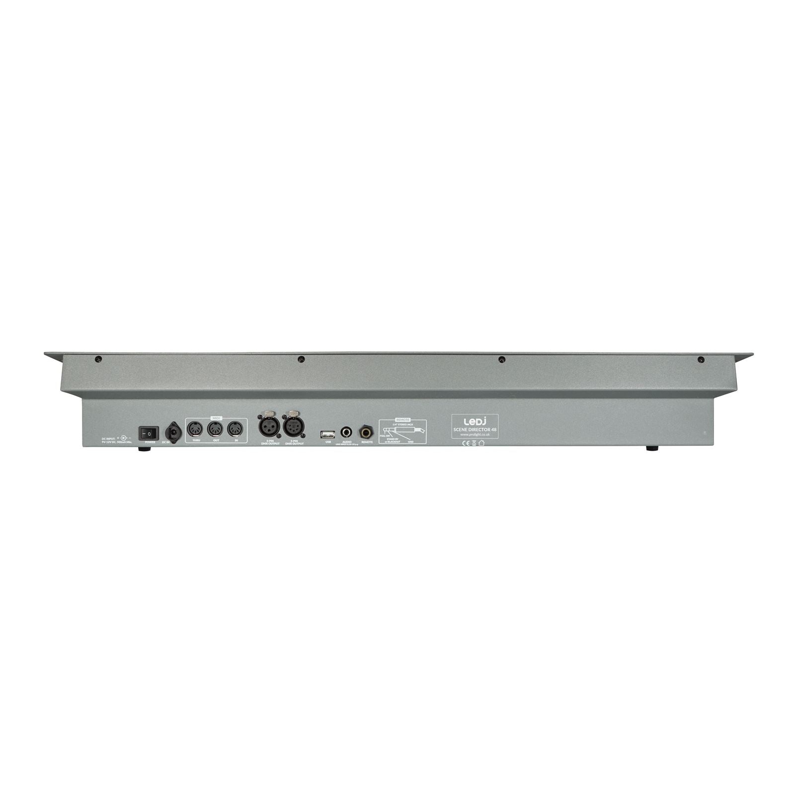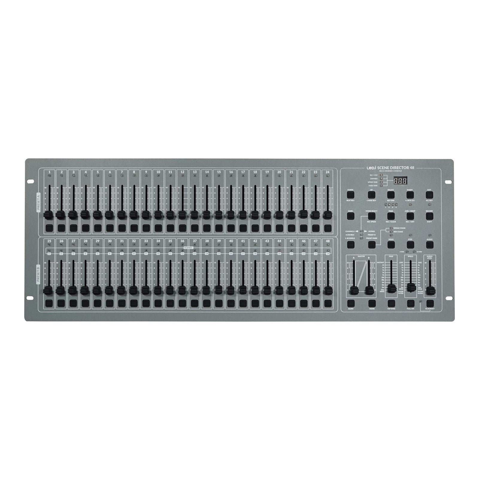 The Scene Director 48 dimmer console from LEDJ allows up to 4,600 programmable scenes and 96 programmable chases (all password protected) and up to 1,000 scenes per chase, you can rest easy that your unique set-up is kept secure while it runs 12 chases simultaneously. The 24 bottom faders can be assigned to programmed chases, allowing control over separate channels in addition to programmed scenes and chases. The speed can be adjusted via the speed fader and a tap sync button. The Scene Director also incorporates an audio input and built-in microphone, allowing sound-to-light control. Also on-board are two master faders, a black-out button and an easy-to-read LED display.