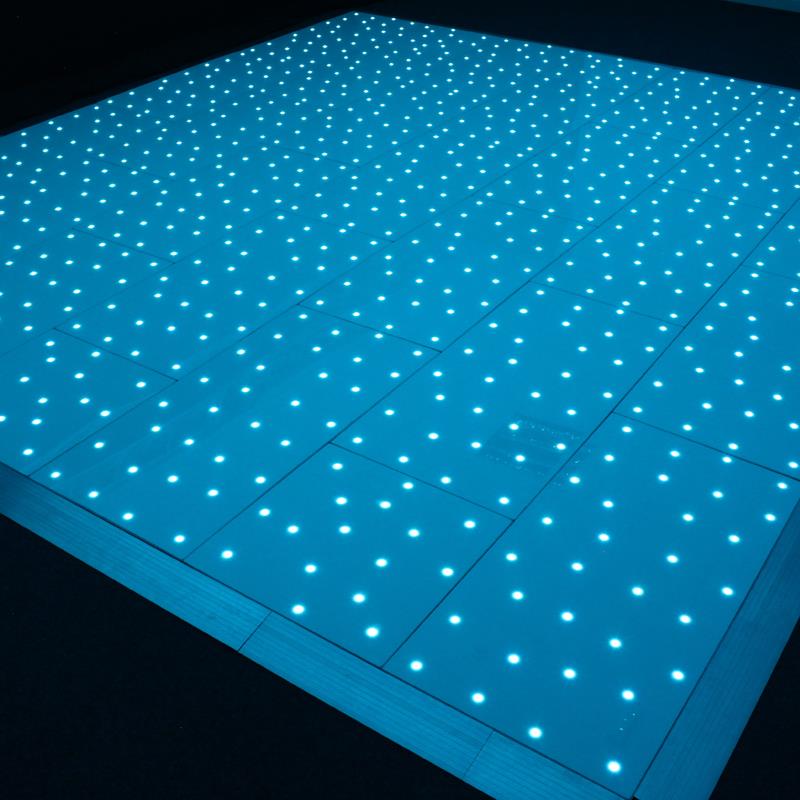 Portable, starlit dance floor system with crisp white LEDs inset into high gloss black or white interlocking panels.