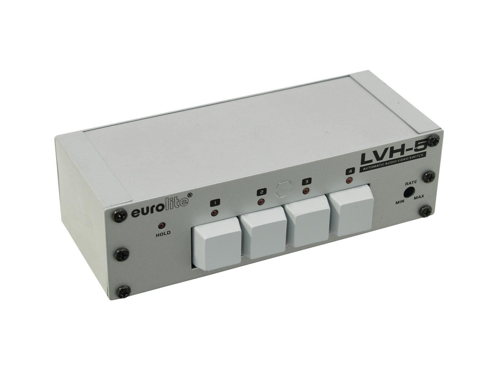 MANUAL AV SWITCH 4:1 The LVH-5 was designed to switch video signals from up to four sources to one output. Switching is made automatically and is indcated by control LEDs. The switching time is adjustable. Each channel features a manual override button to stop the sequencing mode. Each input is provided with a parallel output for feed-through of the input signal. The open collector outputs allow for controlling other units. Power connections are made using block terminals. The unit is compatible with NTSC and PAL systems.