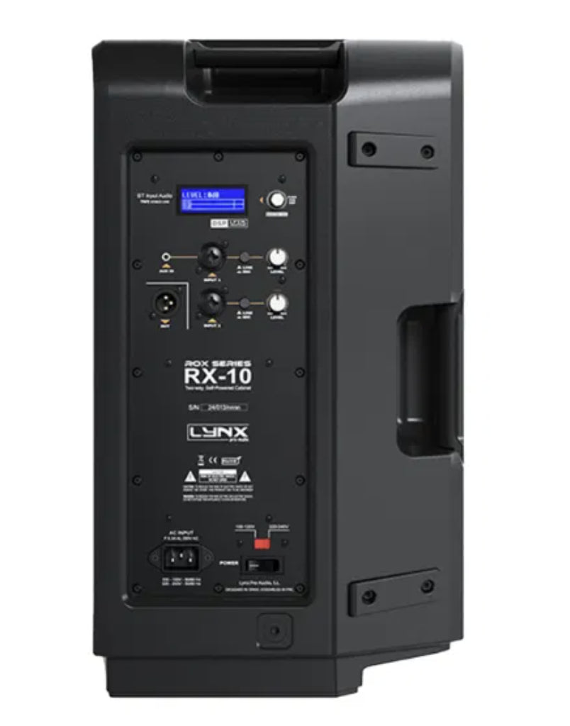 The Lynx Pro Audio RX-10 is a high-performance 2-way active PA system from the ROX Series, designed for both portable and fixed sound reinforcement. Featuring a 10-inch low-frequency driver with 2” voice coil and a 1” compression driver, it delivers 280W RMS and up to 600W peak output via a Class-D amplifier. FIR filter DSP ensures linear phase response and improved sound accuracy, while onboard EQ, delay, sub crossover and scene memory provide maximum flexibility. The RX-10 also supports Bluetooth TWS stereo pairing for wireless playback and cabinet linking. With a maximum SPL of 119 dB (125 dB peak), 90° x 60° coverage, and rugged polypropylene housing, it is ideal for bars, clubs, live events, and corporate sound applications.