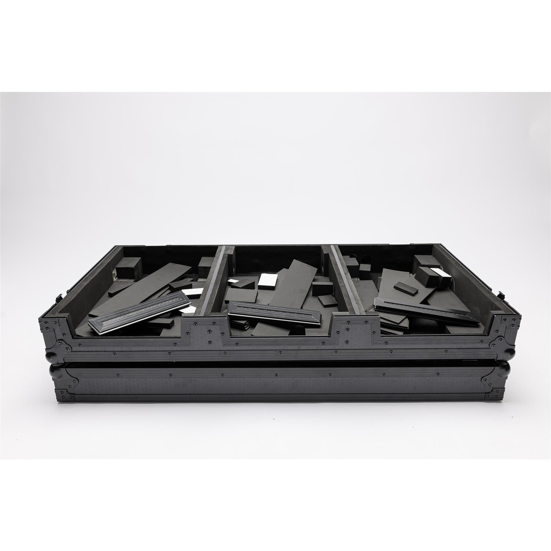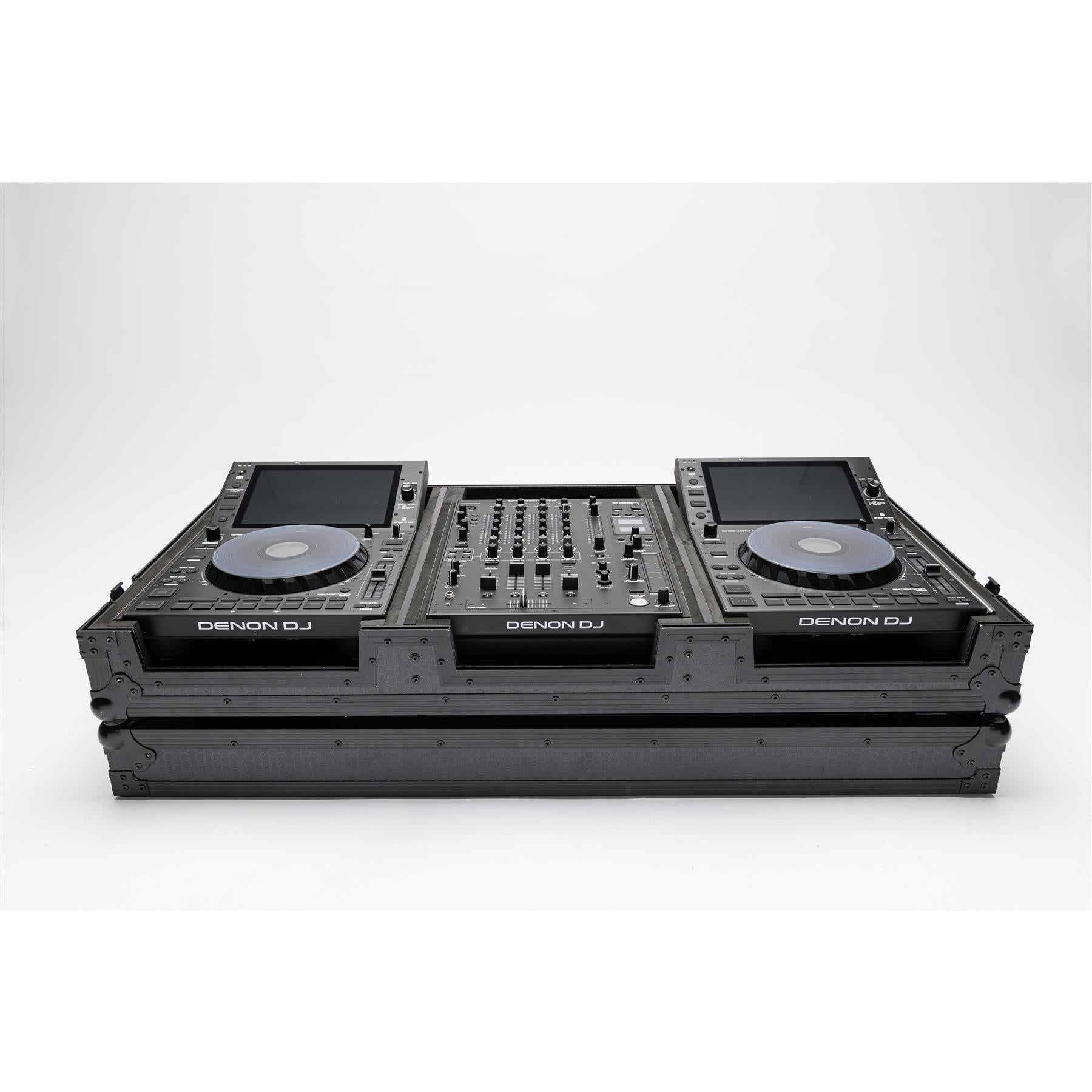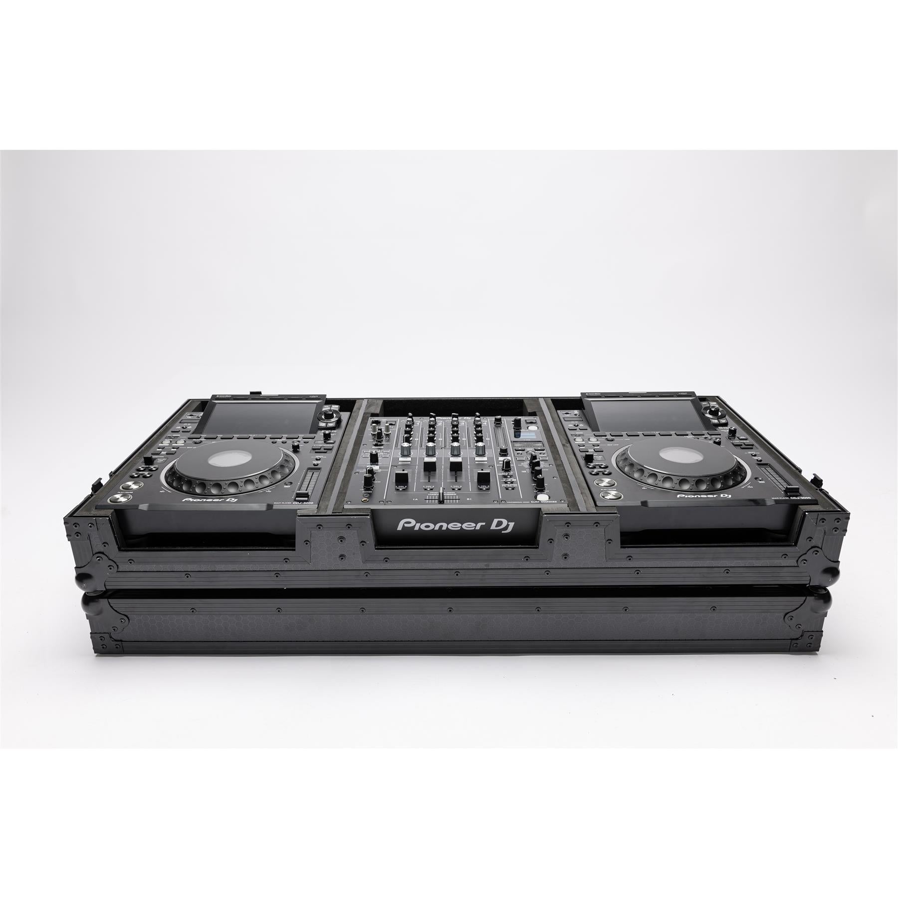 One size fits all! Custom designed for the mobile DJ to hold two CDJ or multimedia players and one 4-channel club mixer. Each CD-player and mixer compartment provides additional foam strips to ensure a universal fit for Pioneer DJ, Denon, Allen & Heath, Rane, Reloop, and other models. Crafted from 9 mm vinyl laminated plywood, sturdy aluminum profiles, heavy-duty butterfly latches, and smooth rolling wheels, this case provides ultimate protection for mobile use on the road.