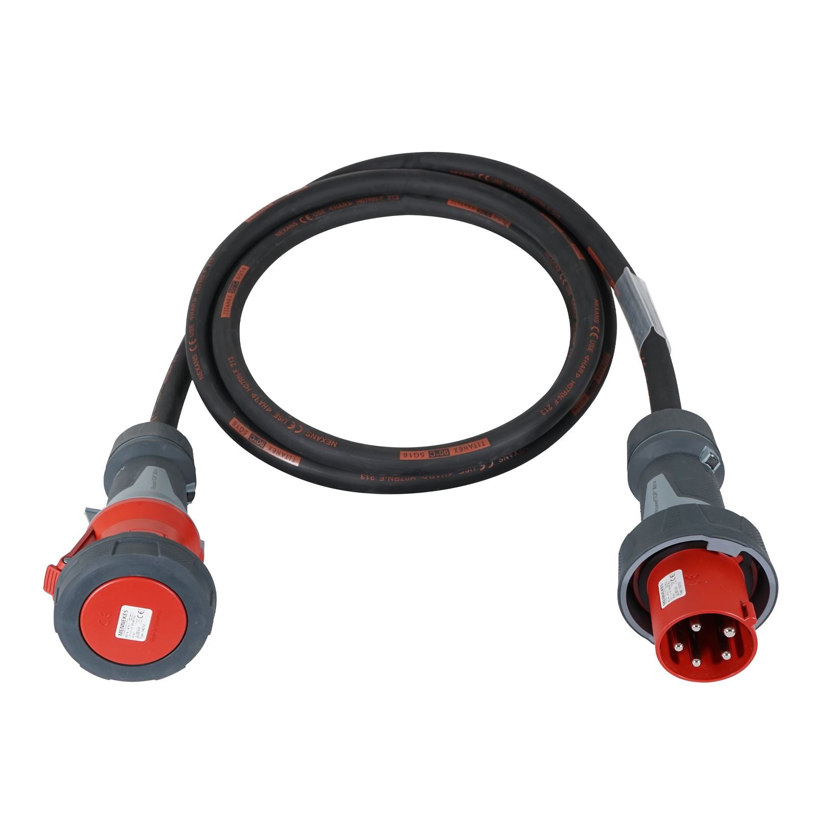 63A 415V three phase cables manufactured with H07RNF cable and fitted with a 63A 5-Pin Mennekes PowerTOP Xtra plug and socket in a range of lengths. The cables are finished with a short length of clear heatshrink ready for identification to be added.
