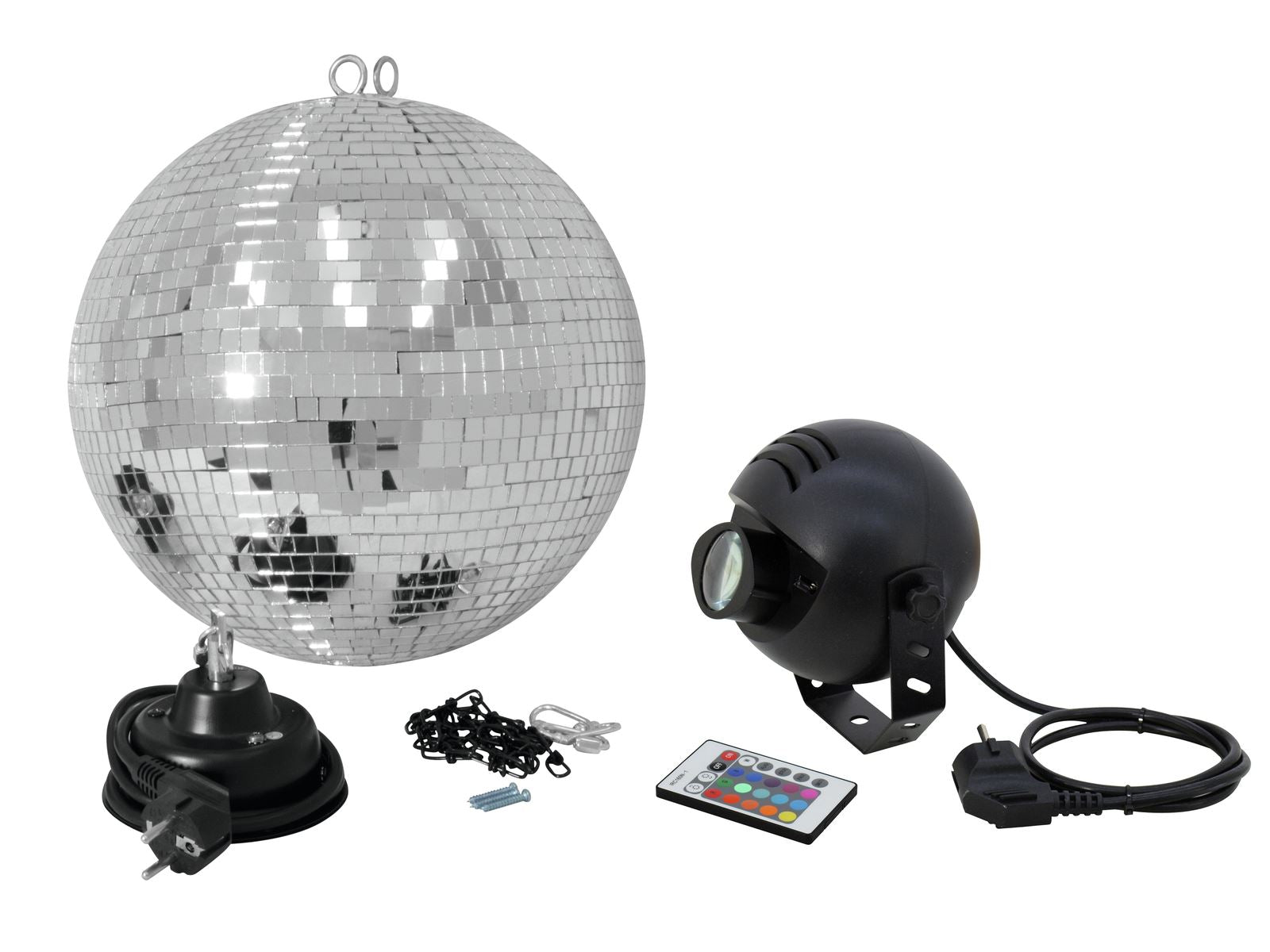 Amazing disco atmosphere and easy operation - this set makes it possible!This affordable Eurolite mirror ball set in professional quality brings brilliant RGB colors to any party location and creates instant disco feel!The set includes a mirror ball with a diameter of 30 cm covered with countless little mirrors. Thanks to the supplied motor, type MD-1015, the ball slowly rotates on its own axis while reflecting colorful light beams to create the familiar disco effect. The necessary light is provided by an Eurolite PST-9W pinspot which, of course, is also included in this set. During operation, you can either rely on the fully automatic mode or you take matters into your own hands and use the supplied IR remote control. You can choose from slowly fading colors and preset intervals for rapid color changes; brightness and color mode can also be adjusted manually. It's entirely up to you to make the most of your event!