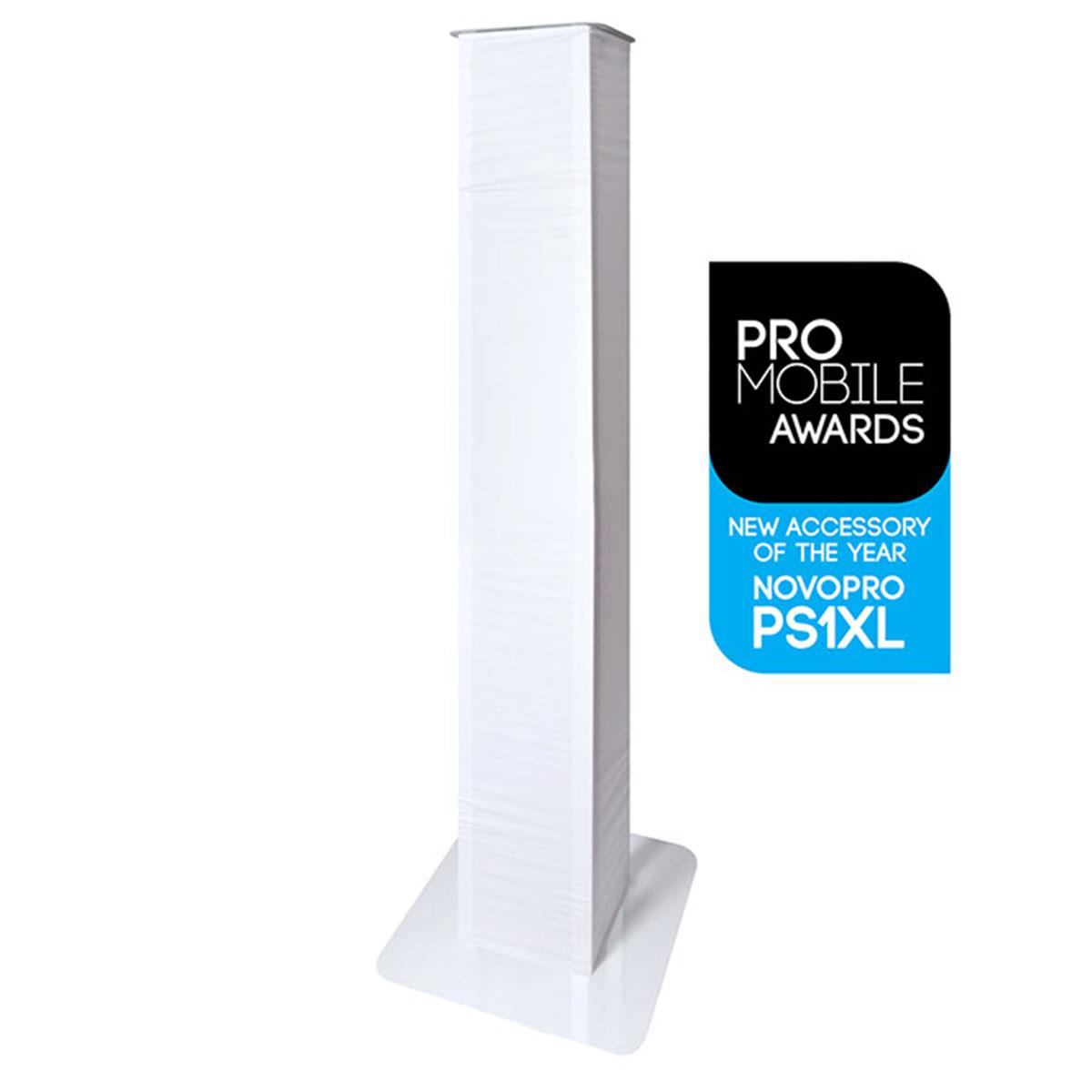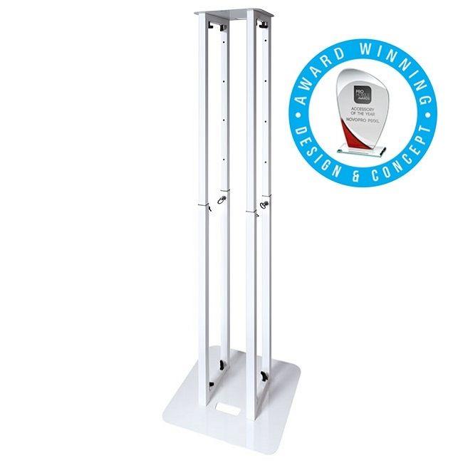 Unique and innovative, variable height podium stands in white with 2 different scrims.